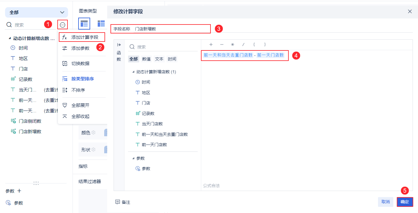 1)添加「计算字段」,将字段名称改为「门店新增数」,门店新增数=前一天和当天去重门店数-前一天门店数,如下图所示: