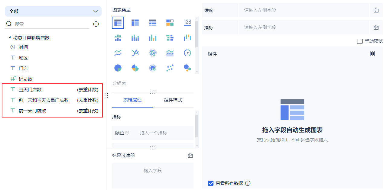 若需要动态显示「当天门店数」、「前一天门店数」、「前一天和当天去重门店数」,则需要指标与日期过滤组件通过参数建立联系。