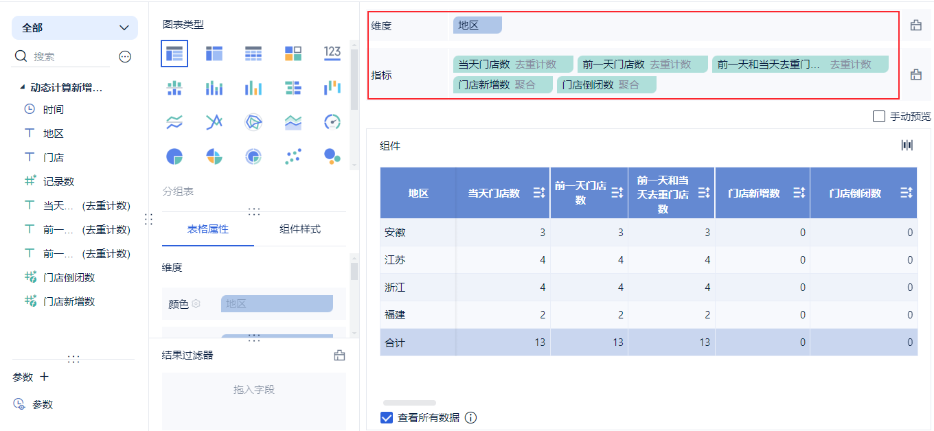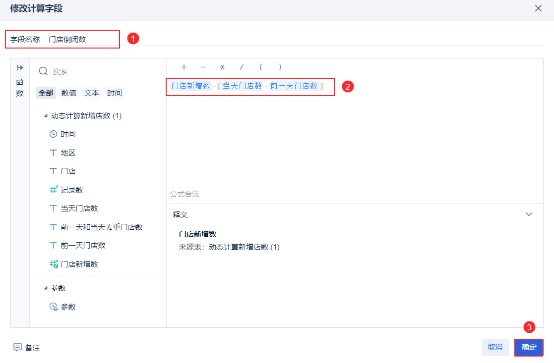 创建计算字段,计算「门店新增数」和「门店倒闭数」