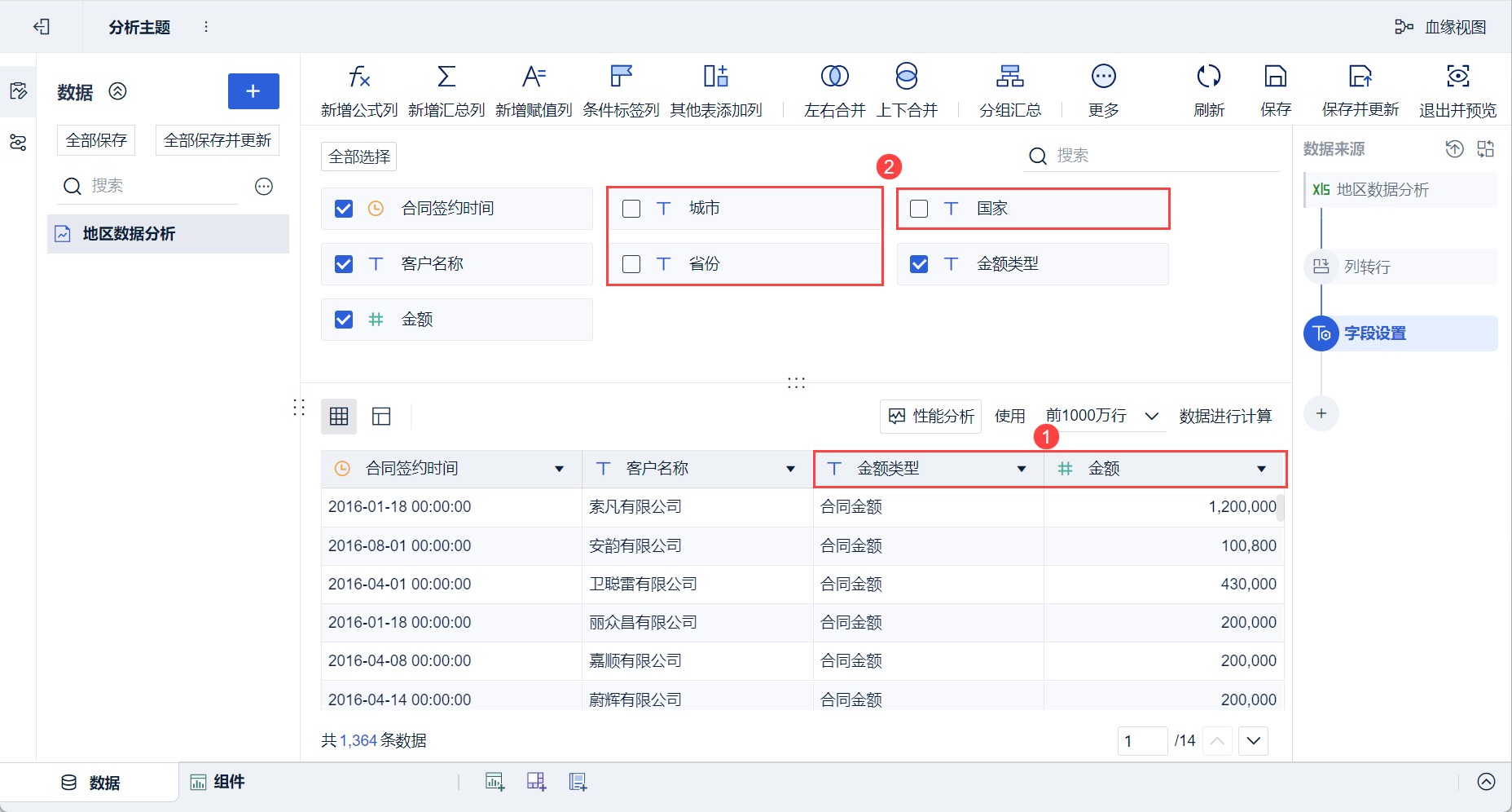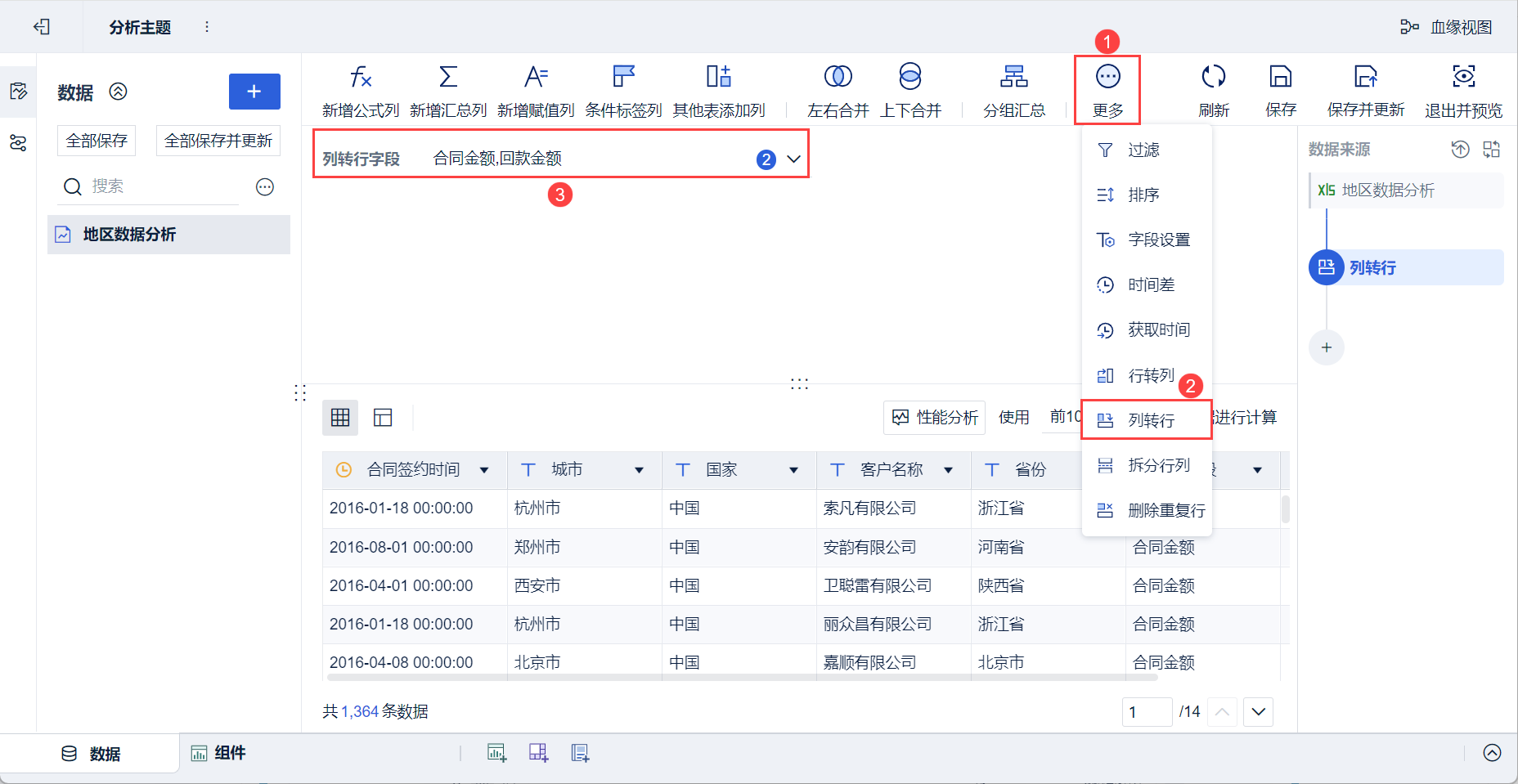 4)点击功能栏的「更多」,选择「列转行」,将「合同金额」、「回款金额」字段列转行,如下图所示: