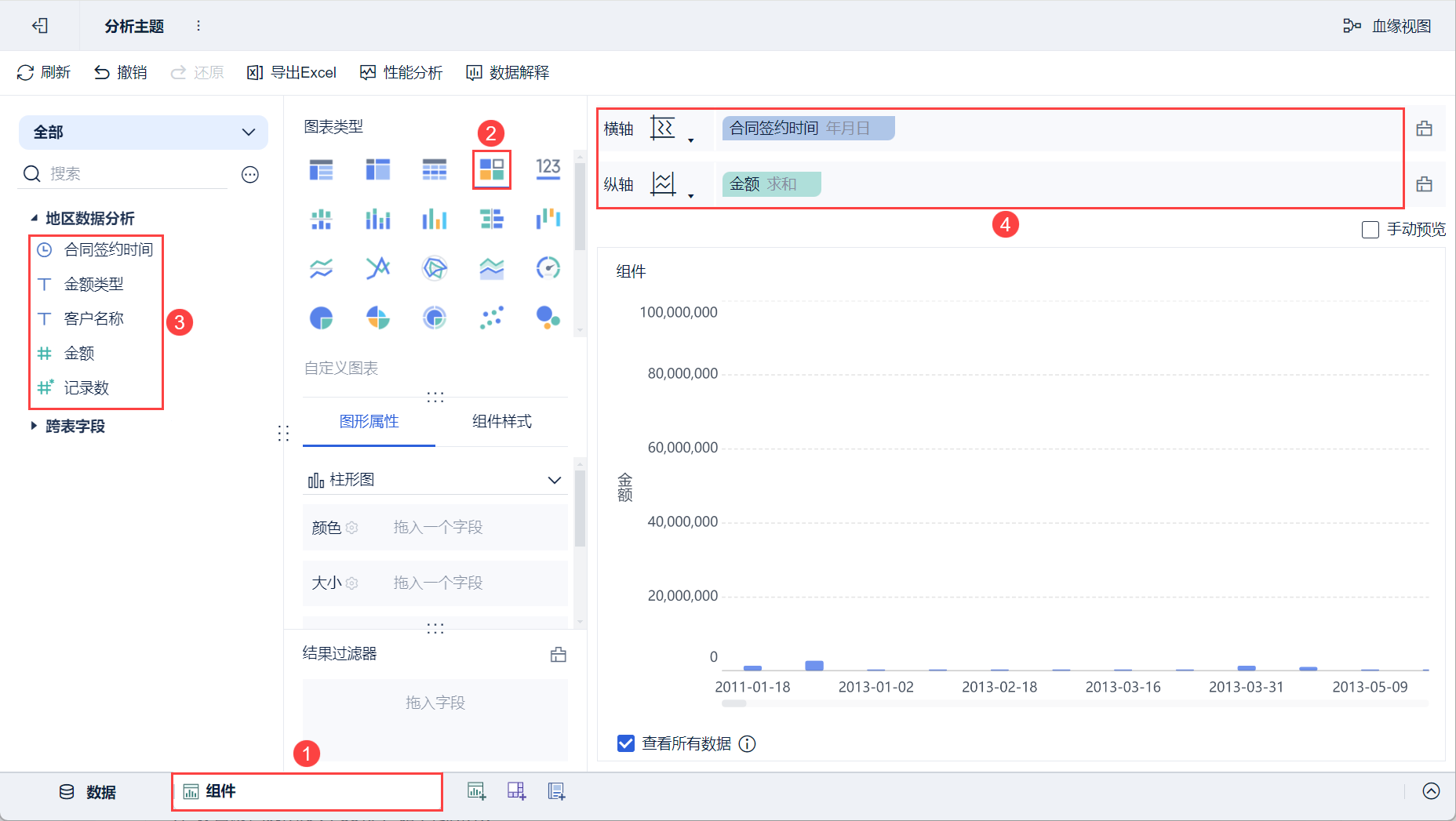 3)将左侧待分析区域的「合同签约时间」字段拖入分析区域的横轴,「金额」拖入纵轴,如下图所示: