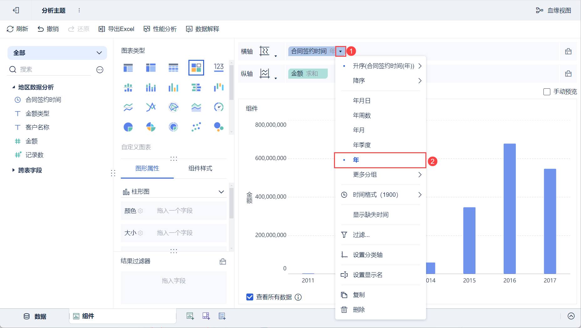 4)点击横轴「合同签约时间」的下拉按钮,设置为「年」分组,如下图所示: