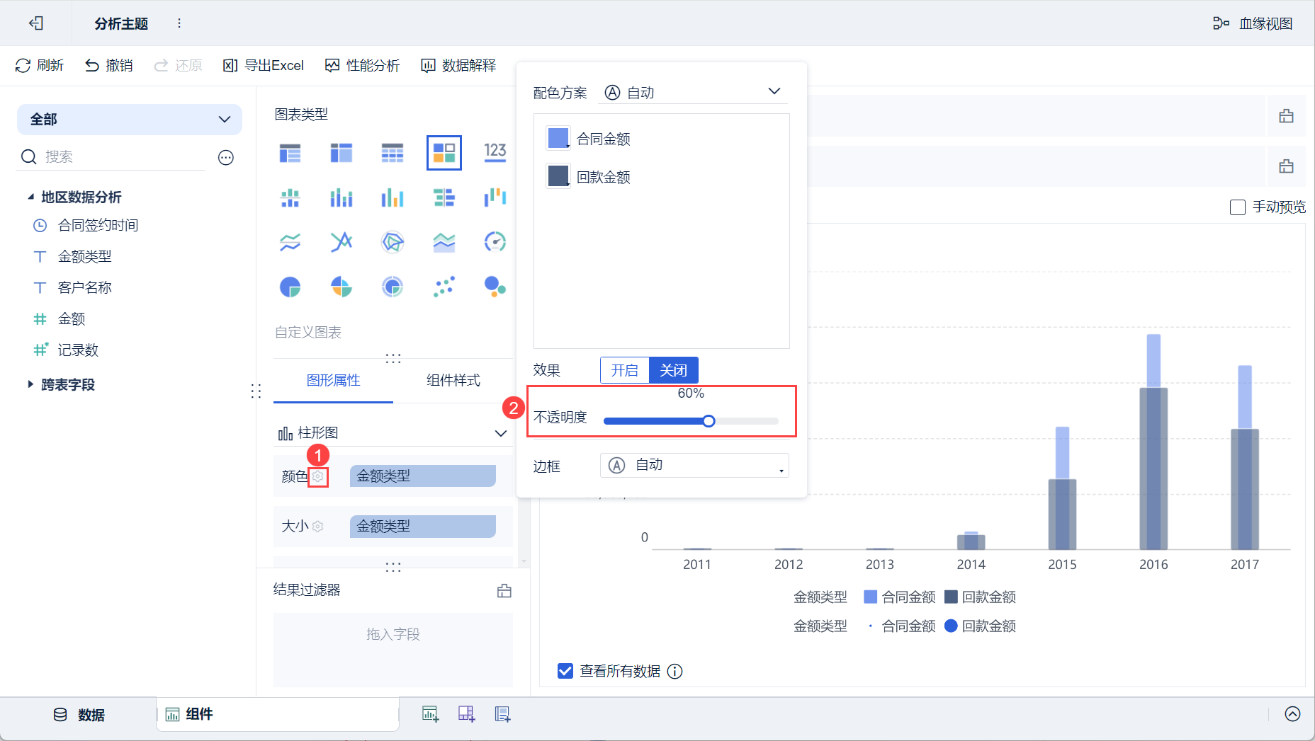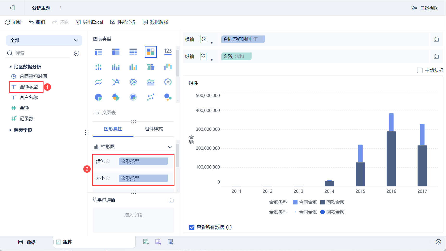 5)将左侧待分析区域的「金额类型」拖入「图形属性」下的颜色栏和大小栏,如下图所示: