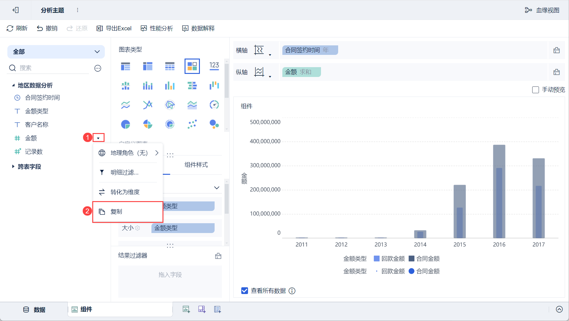 1)点击左侧待分析区域的「金额」字段的下拉按钮,选择「复制」,复制两个「金额」字段,如下图所示: