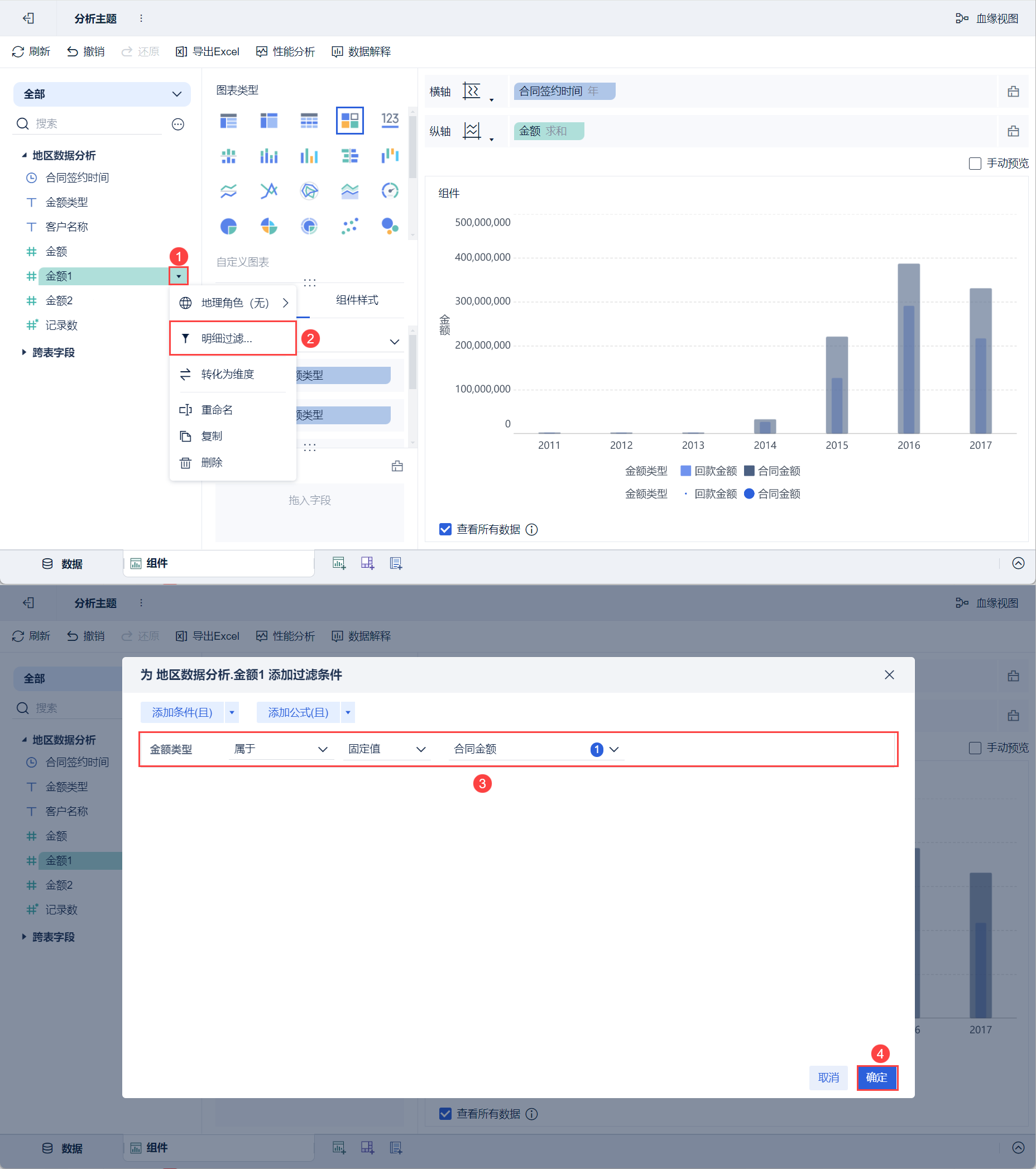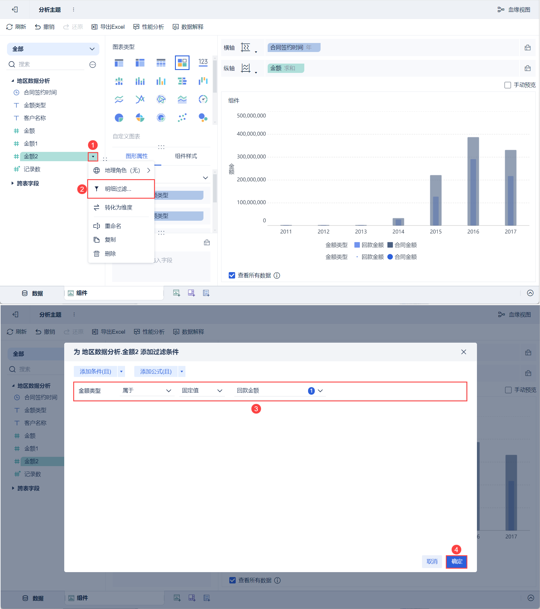 2)点击复制的「金额1」的下拉按钮,选择「明细过滤」,在弹出的设置框中添加过滤条件,过滤出金额类型属于「合同金额」的数据,点击「确定」,如下图所示: