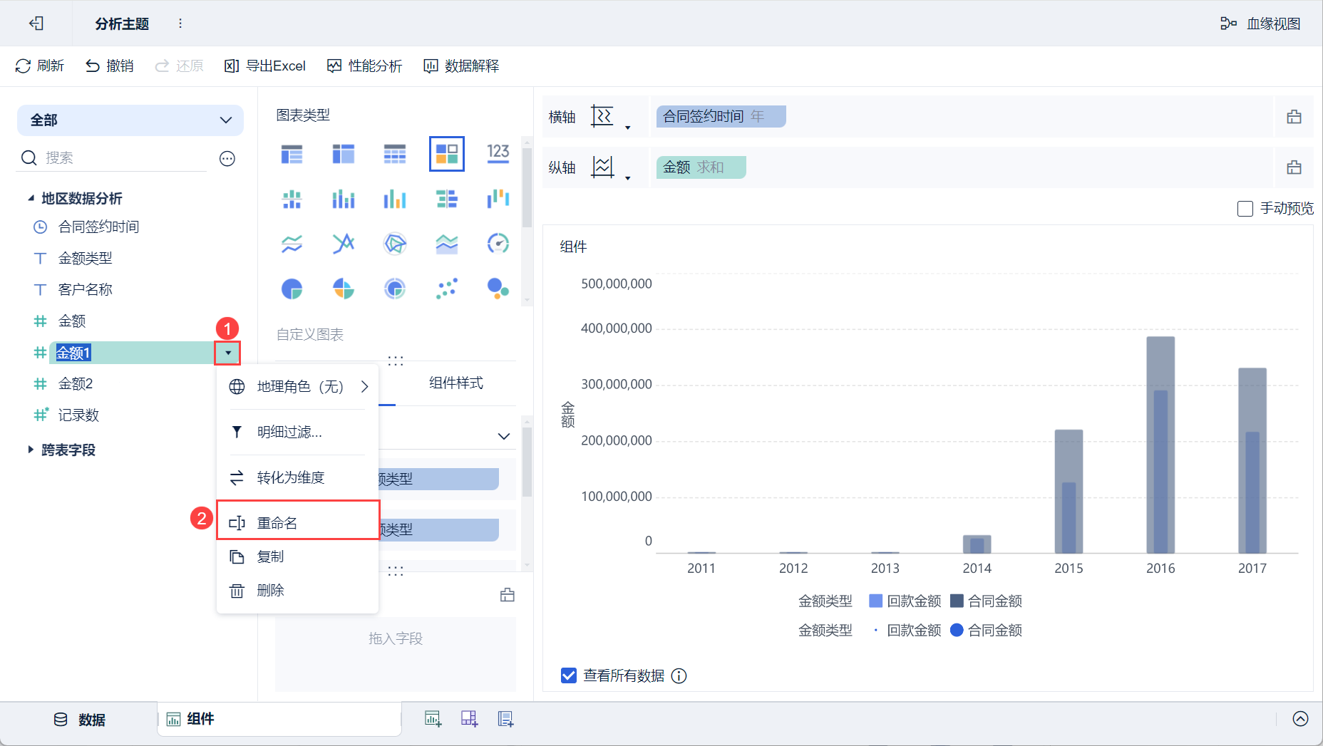 4)点击「金额1」的下拉按钮,选择「重命名」,重命名为「合同金额」,如下图所示: