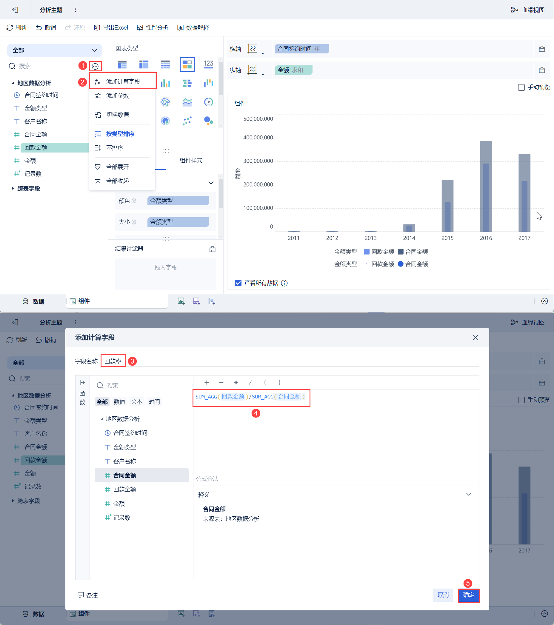 6)点击左侧待分析区域搜索栏旁的「...」,选择「添加计算字段」,在弹出的设置框中输入字段名称为「回款率」,输入公式:SUM_AGG(回款金额)/SUM_AGG(合同金额),点击「确定」,如下图所示:
