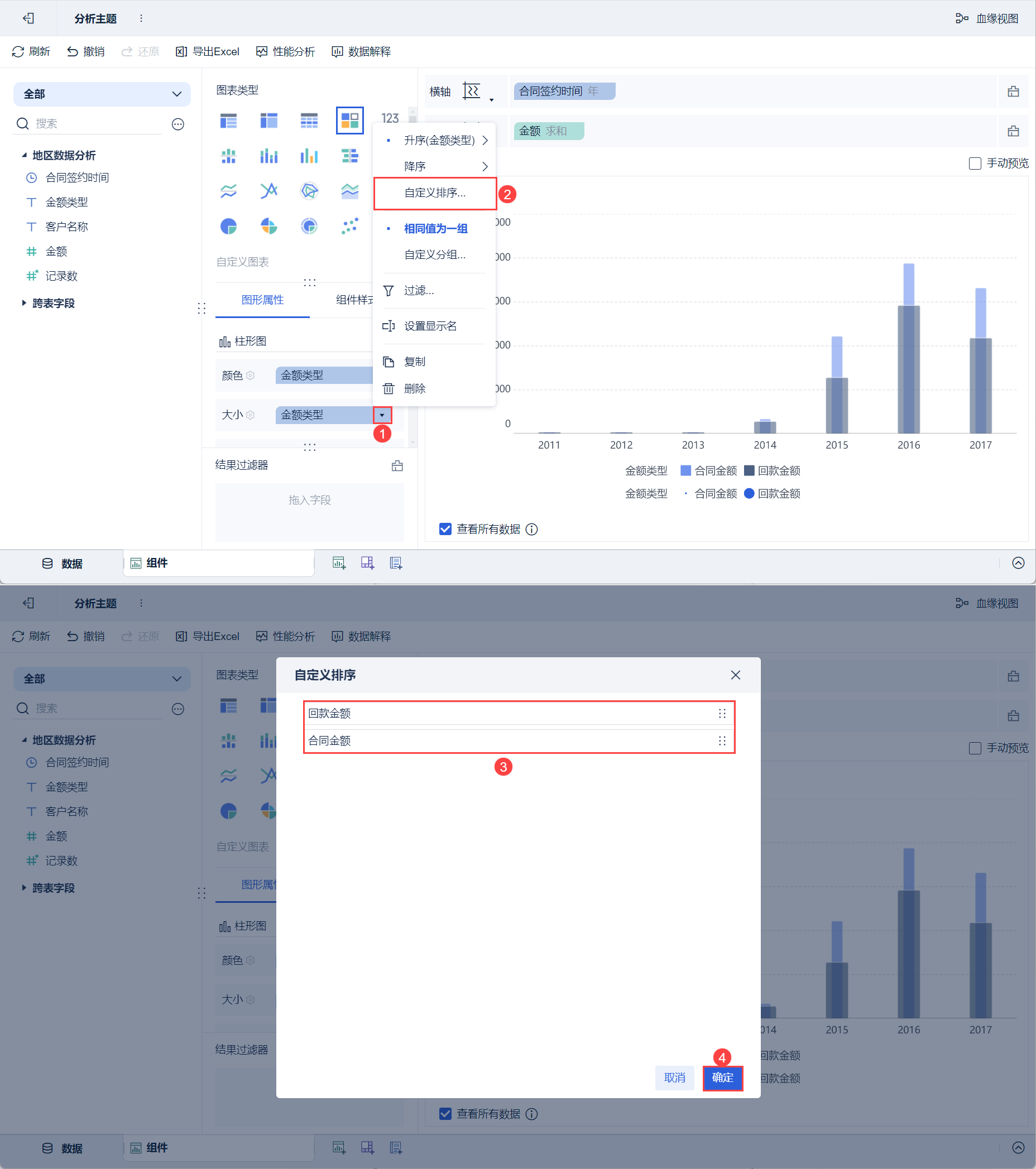 7)点击大小栏中的「金额类型」的下拉按钮,选择「自定义排序」,拖拽「合同金额」与「回款金额」进行排序,如下图所示: