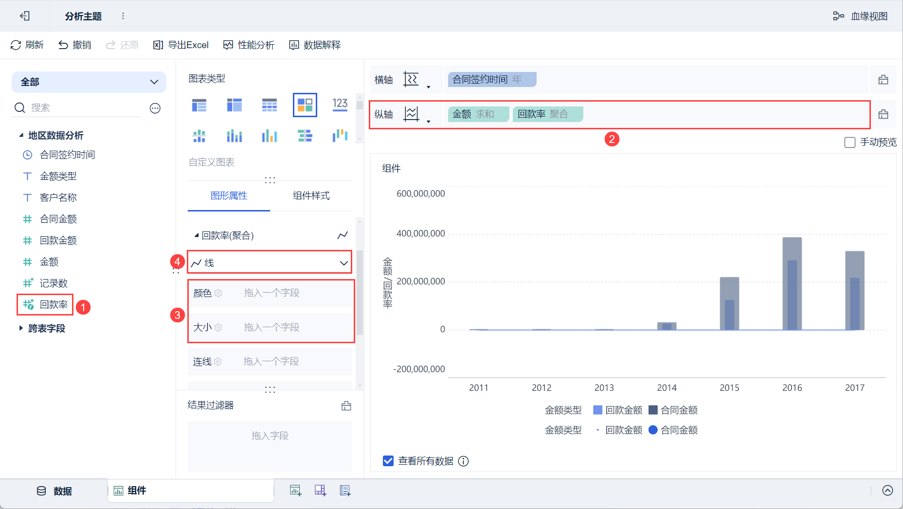 7)将刚刚添加的「回款率」计算字段拖入分析区域的纵轴,清空「图形属性>回款率」下的颜色栏大小栏的字段,形状选择「线」,如下图所示: