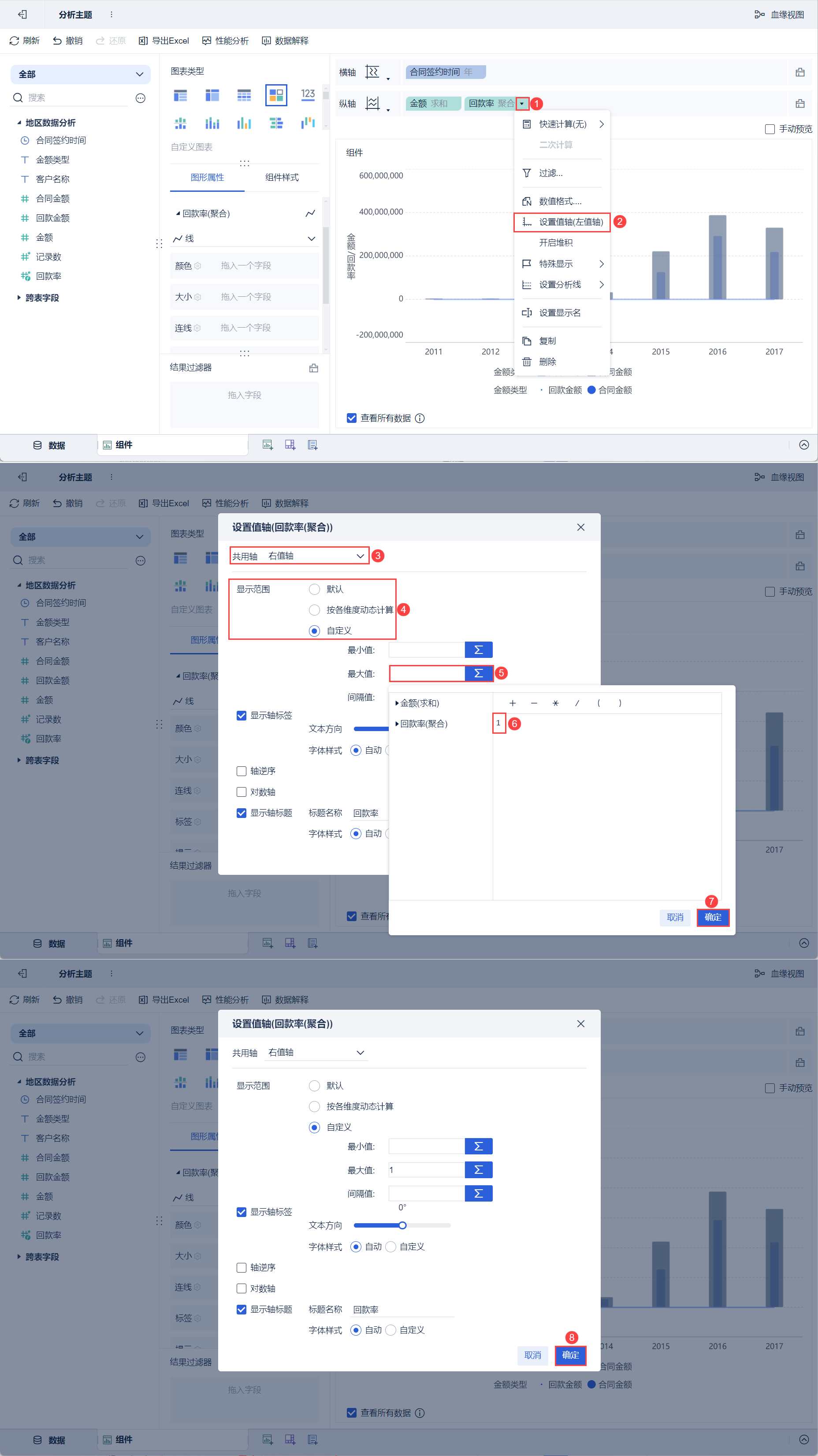 8)点击纵轴「回款率」的下拉按钮,选择「设置值轴(左值轴)」,在弹出的设置框中共用轴选择「右值轴」,显示范围勾选「自定义」,最大值设置为「1」,点击「确定」,如下图所示: