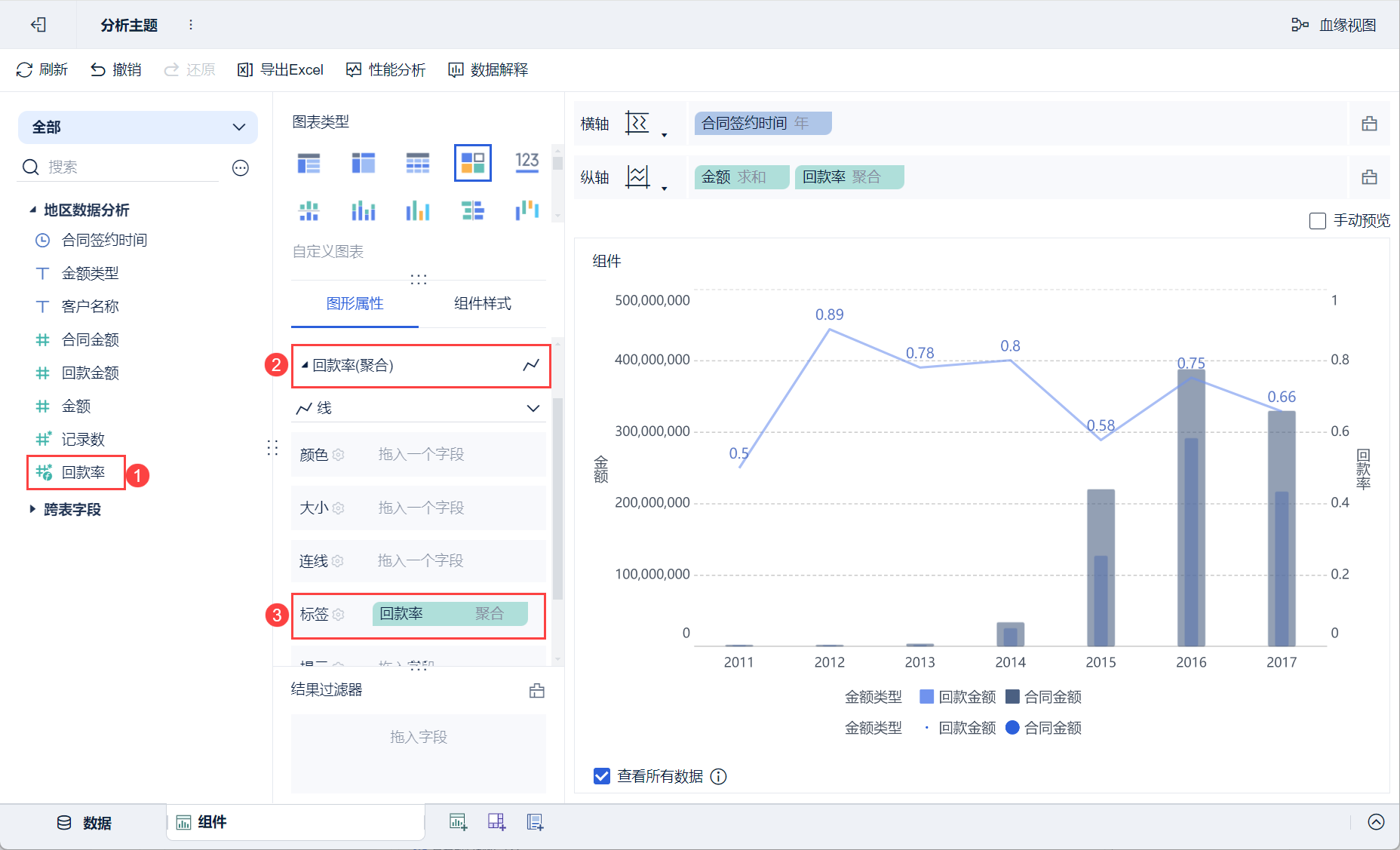 9)将左侧待分析区域的「回款率」拖入「图形属性>回款率」下的标签栏,如下图所示: