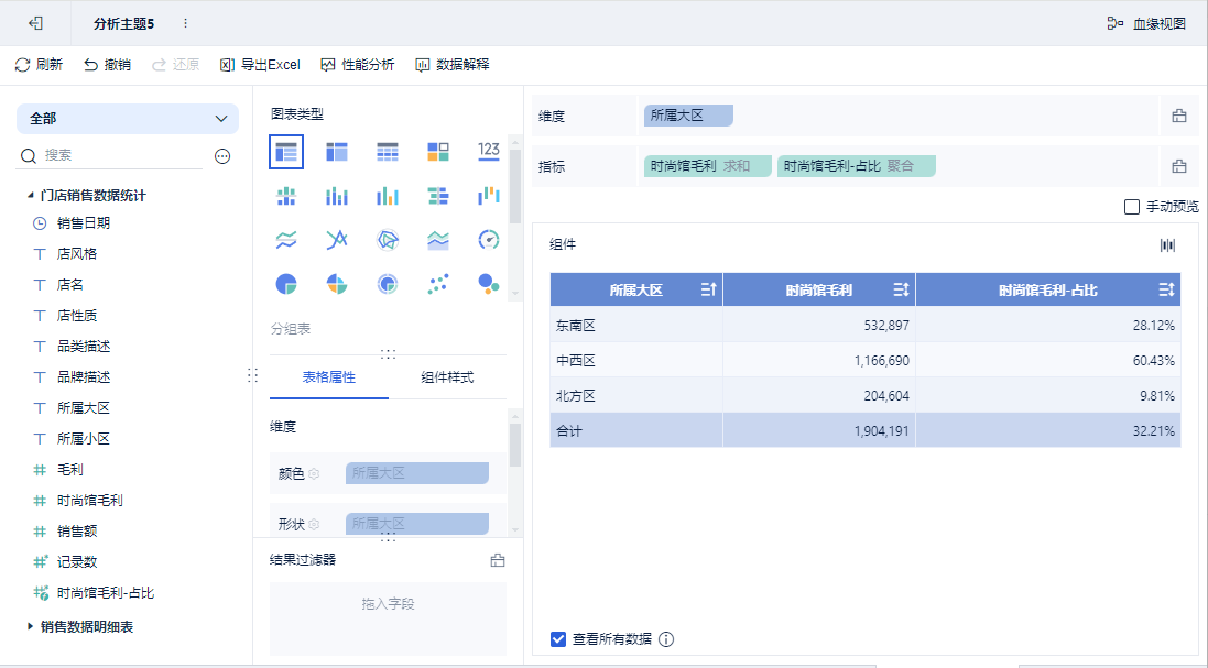 如此我们便得到每个大区下,时尚馆的毛利额各是多少,以及每个大区时尚馆毛利占总毛利的占比。