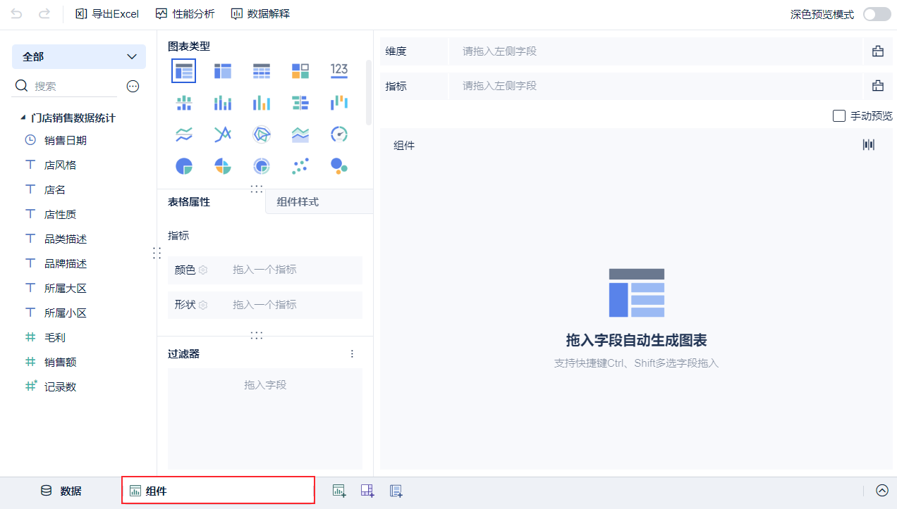 创建分析主题,上传 FineBI 自带的数据表「门店销售统计」,添加组件。如下图所示: