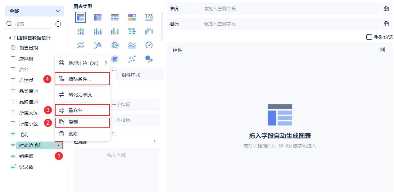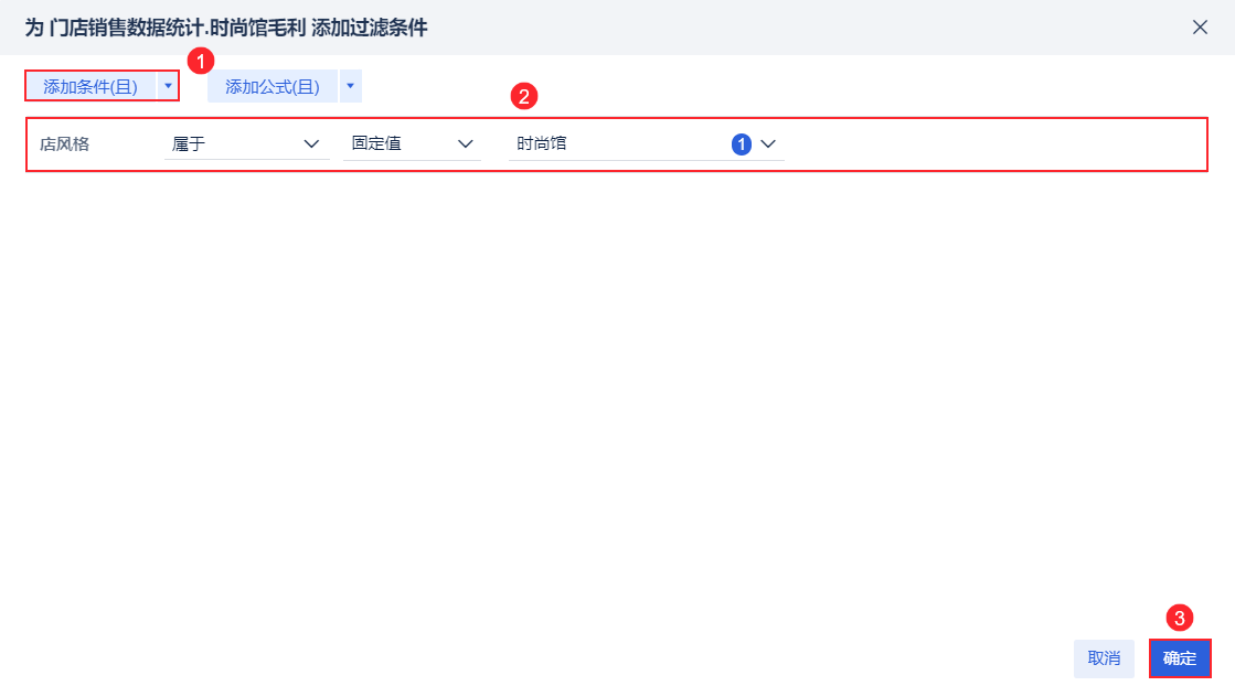 例如,我们可以复制一个「毛利」字段,在指标条件中设置过滤条件为「店风格=时尚馆」,就可以获得新指标「时尚馆毛利」。