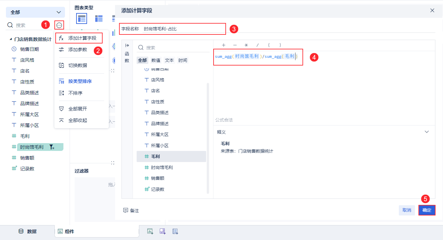 添加计算字段,使用sum_agg(时尚馆毛利)/sum_agg(毛利),就可以得到时尚馆毛利占总毛利的比例,如下图所示: