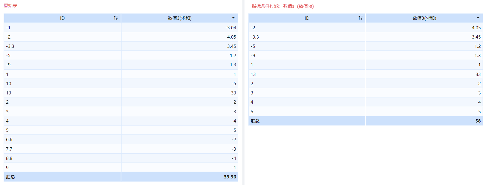 例如:下表只有一个指标字段「数值 3 」,对「数值 3 」进行明细过滤,过滤条件为数值 3>0 ,那么「数值 3 」字段中小于 0 的值整行被去除了,如下图所示: