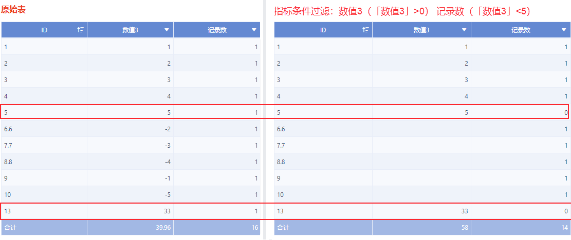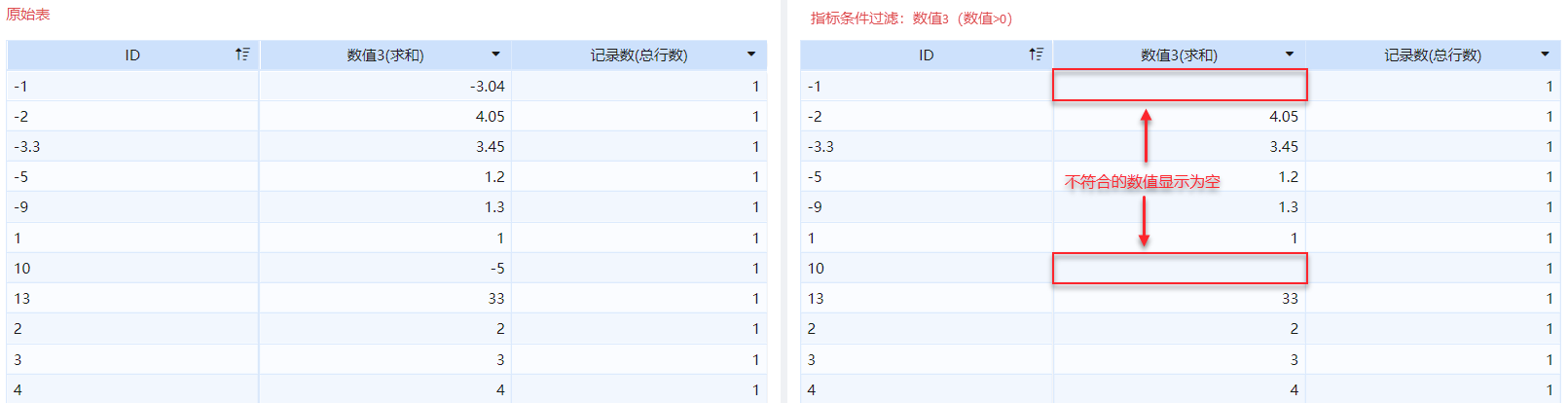例如:下表有两个指标字段「数值 3 」和「记录数」,对「数值 3 」进行明细过滤,过滤条件为数值 3>0 ,不符合的数值显示为空,如下图所示: