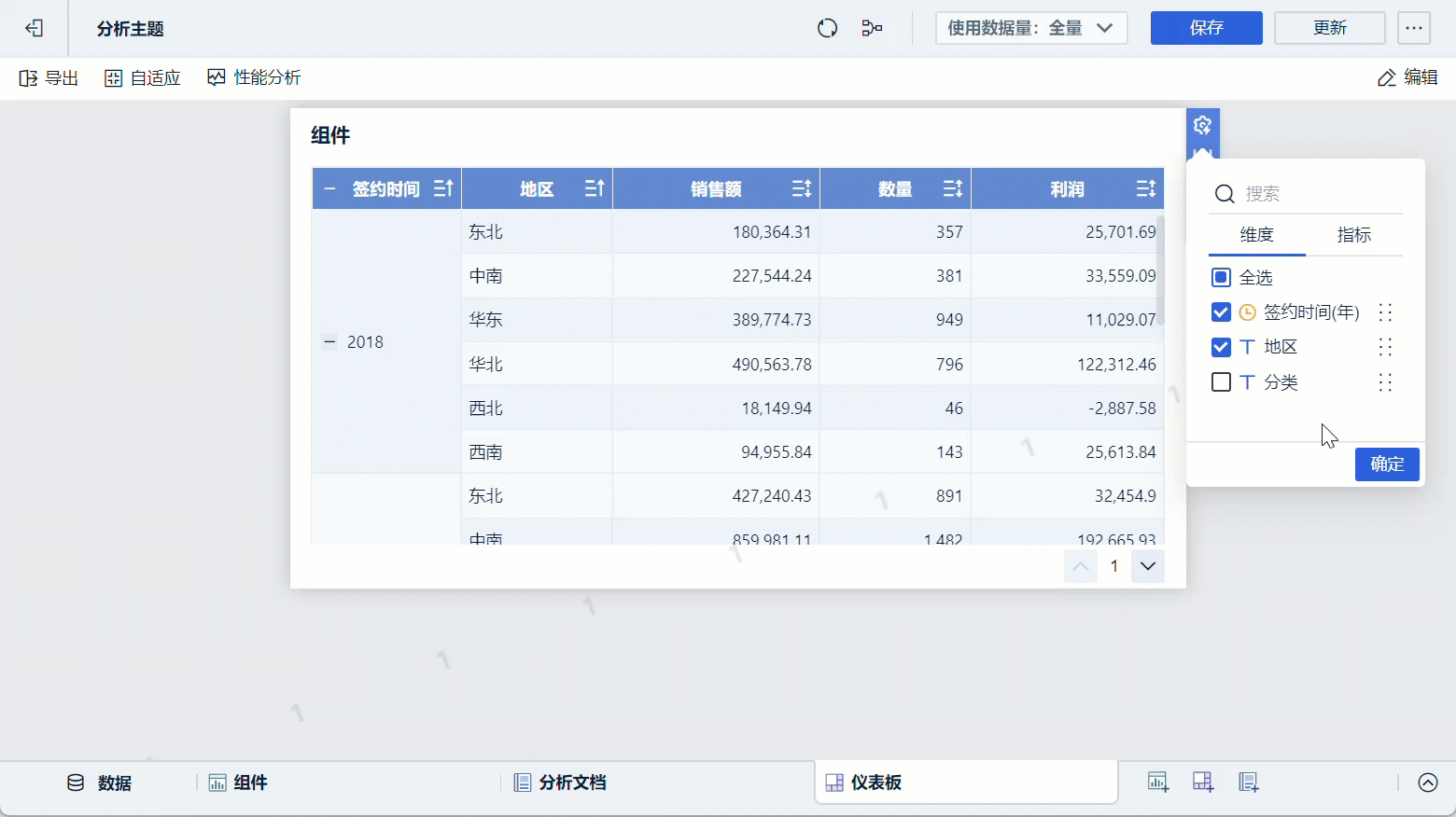用户在查看表格组件时,需要简单快速地实现多维度或多指标的切换,可以点击「快捷设置」按钮,切换字段: