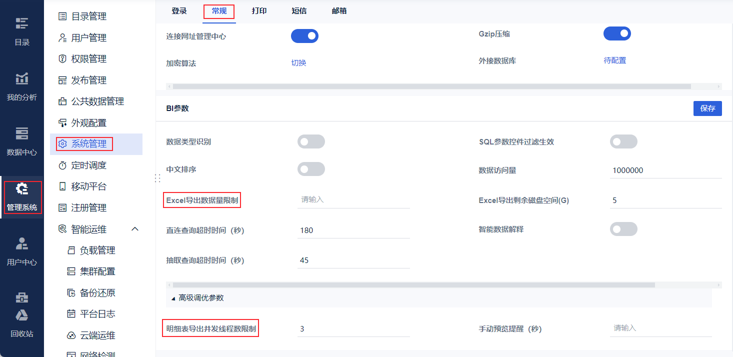 2)设置Excel导出限制参数:「管理系统」>「系统管理」>「常规」中,有两个参数对导出进行限制: