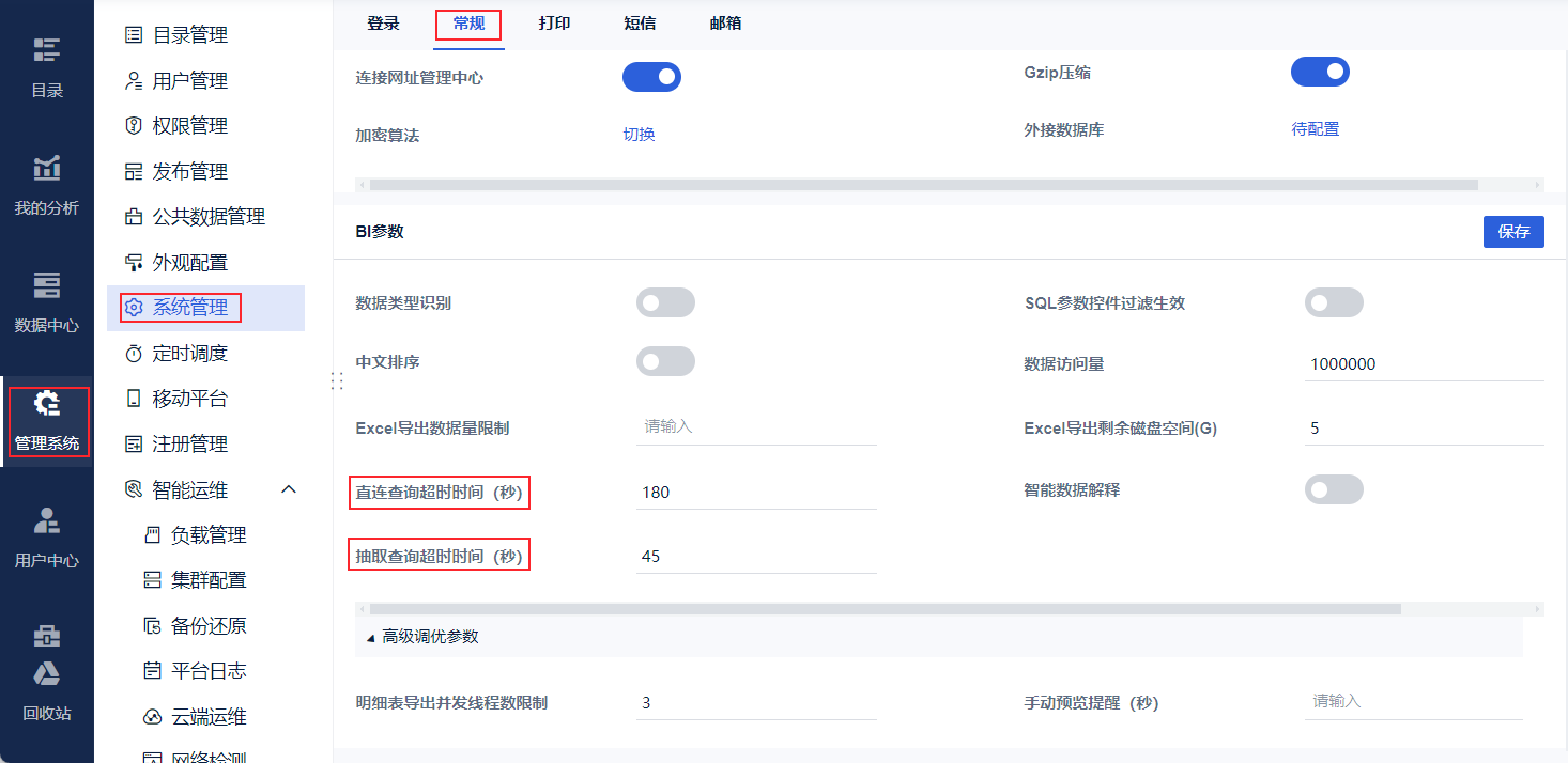 6)限制组件查询时长:「管理系统」>「系统管理」>「常规」,有两个参数对组件查询时长进行限制: