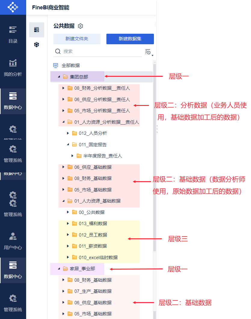 2)由于各公司所处行业、数仓架构各不相同,BI中可以根据公司业务类型、系统、使用部门、公共数据负责人来构建公共数据体系。参考案例: