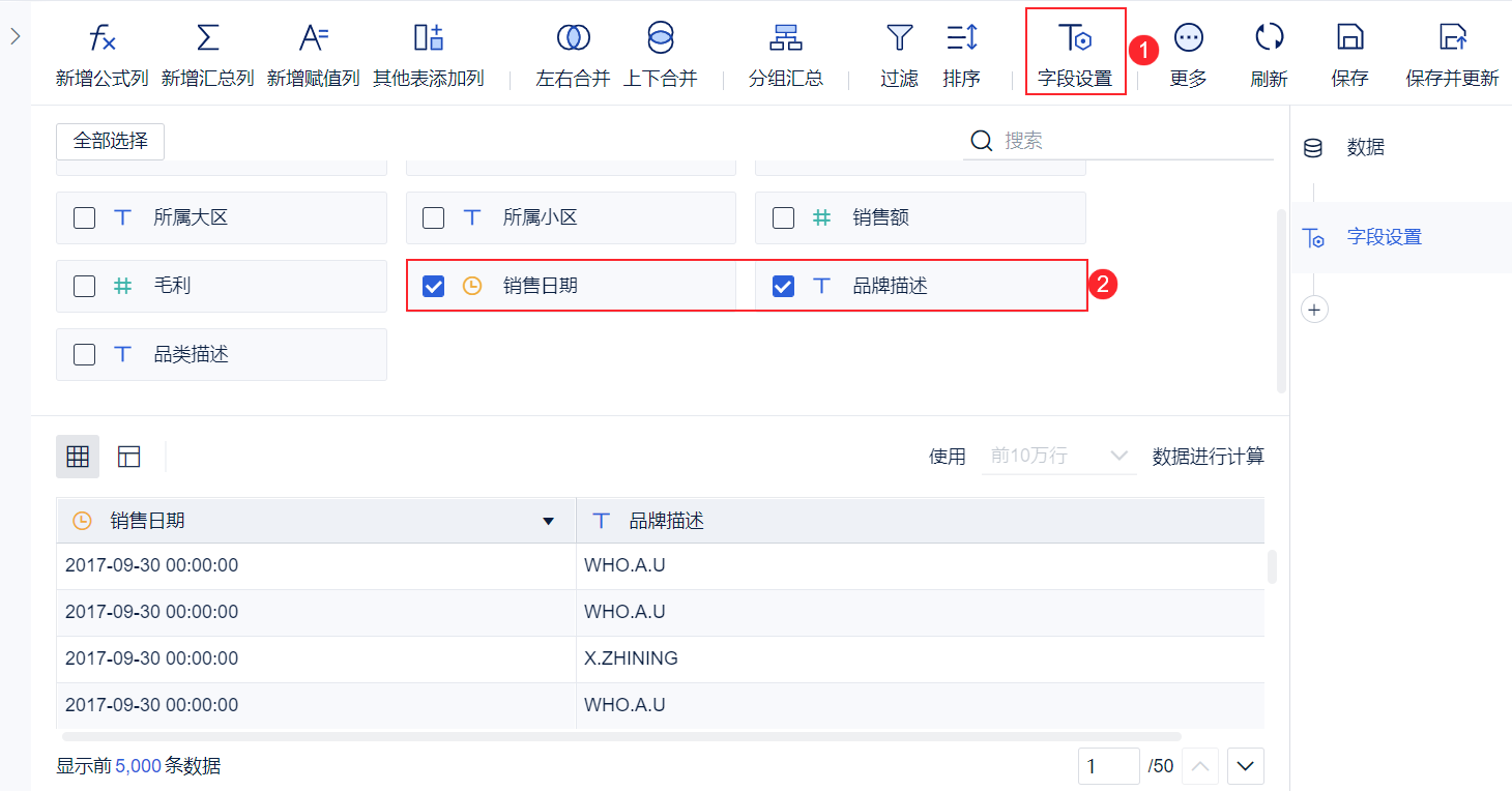 添加「字段设置」,取消全部选择,再选择「销售日期」和「品牌描述」字段,如下图所示: