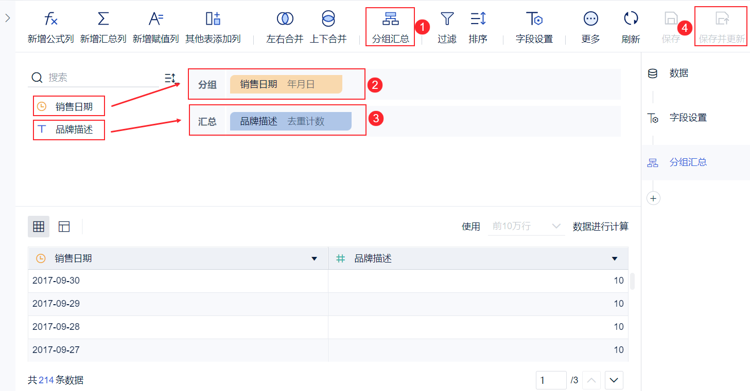 1)添加好字段后,选择「分组汇总」,将「销售日期」字段拖入分组栏,「品牌描述」拖入汇总栏,设置好后点击「保存并更新」,如下图所示: