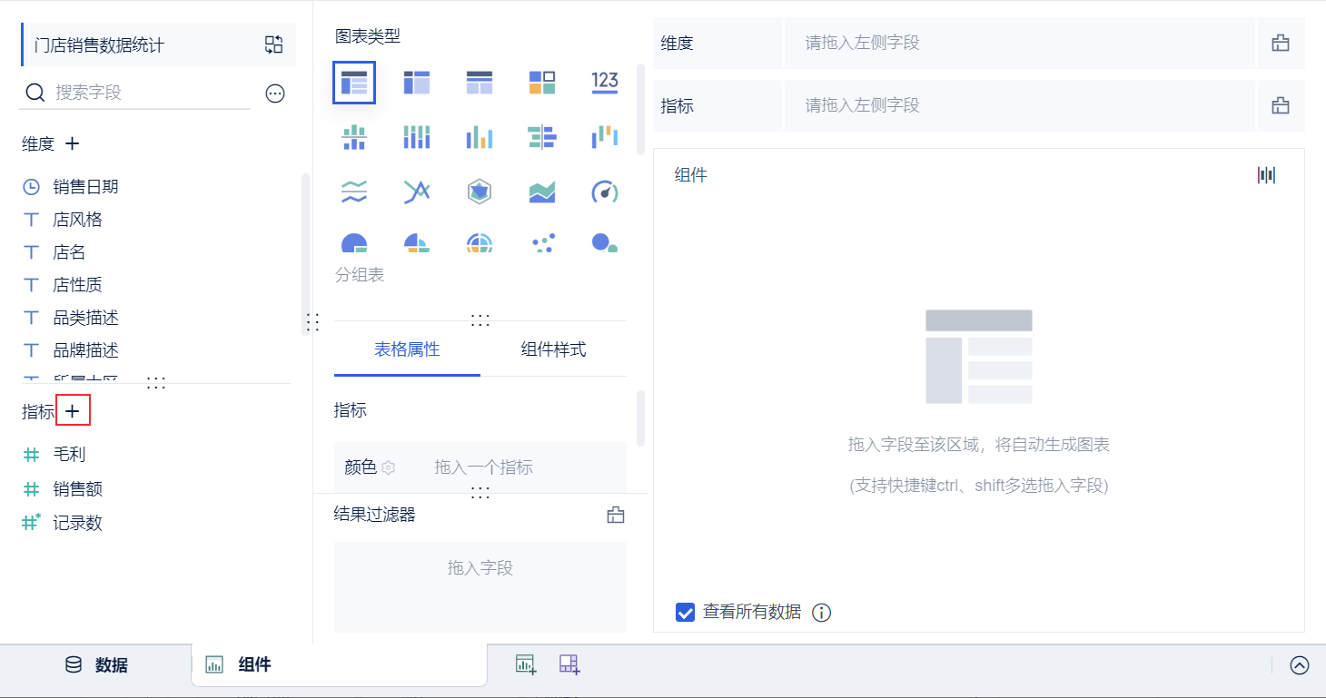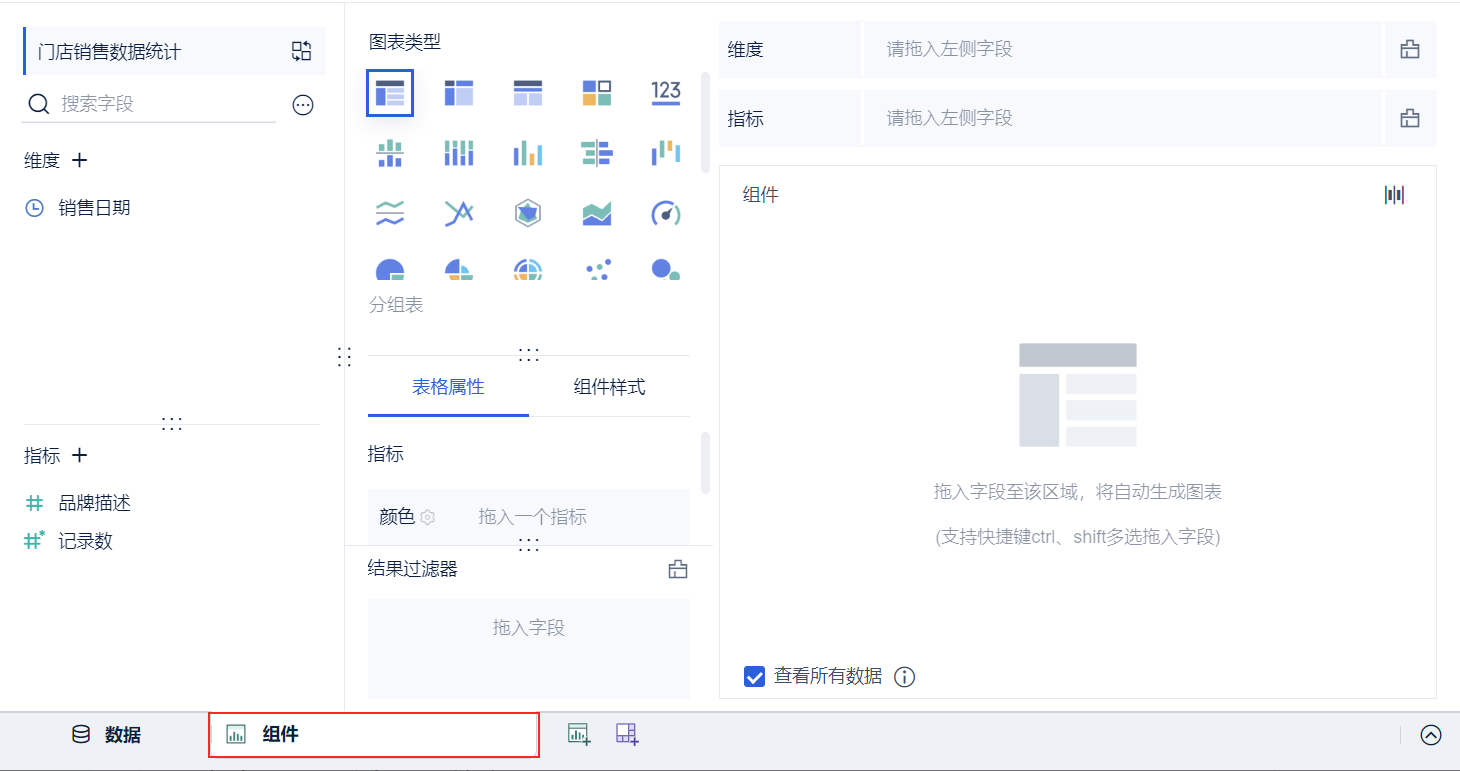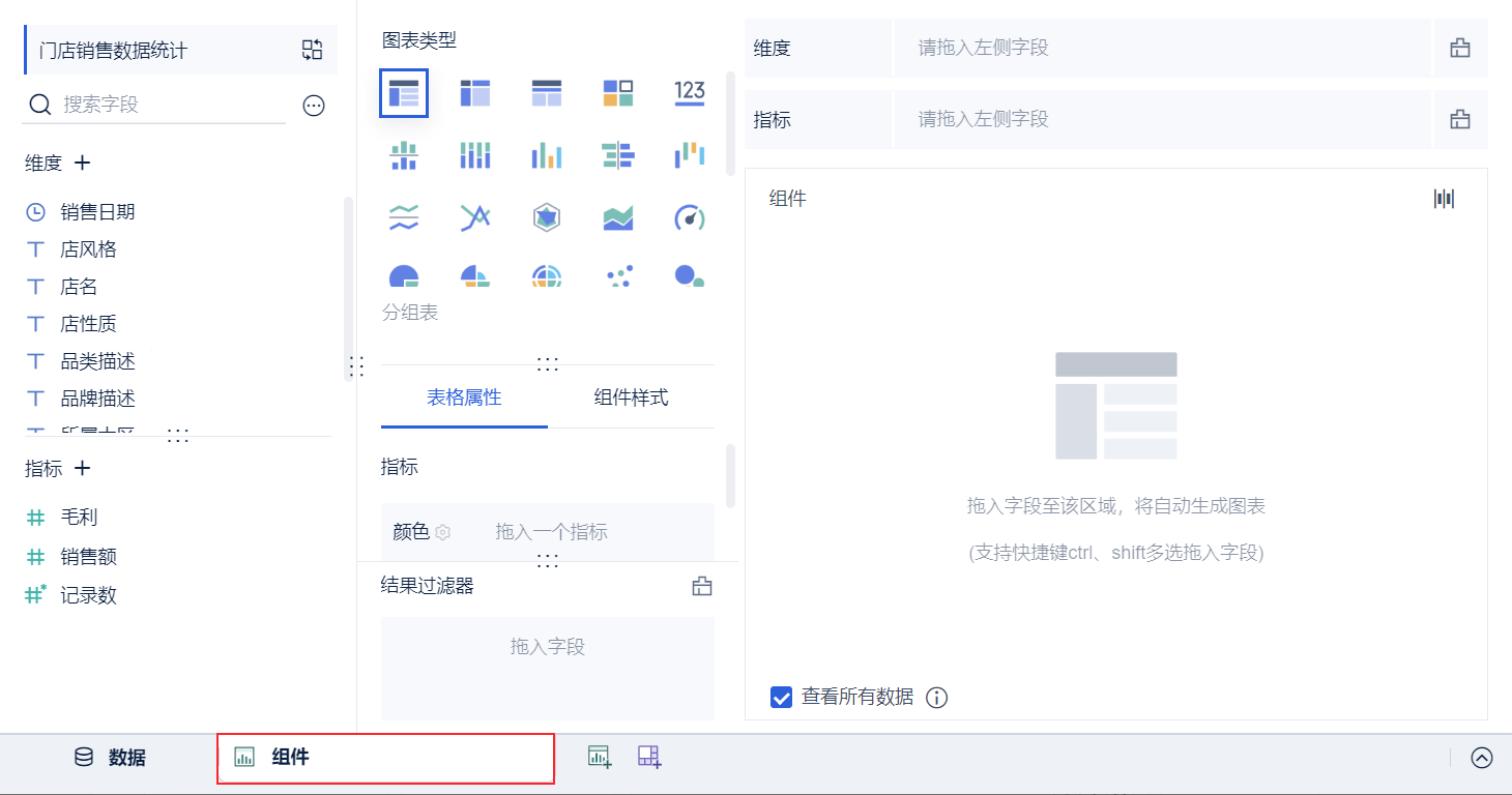 使用「门店销售数据统计表」添加组件,步骤同上,详情请参见本文 3.2 节。