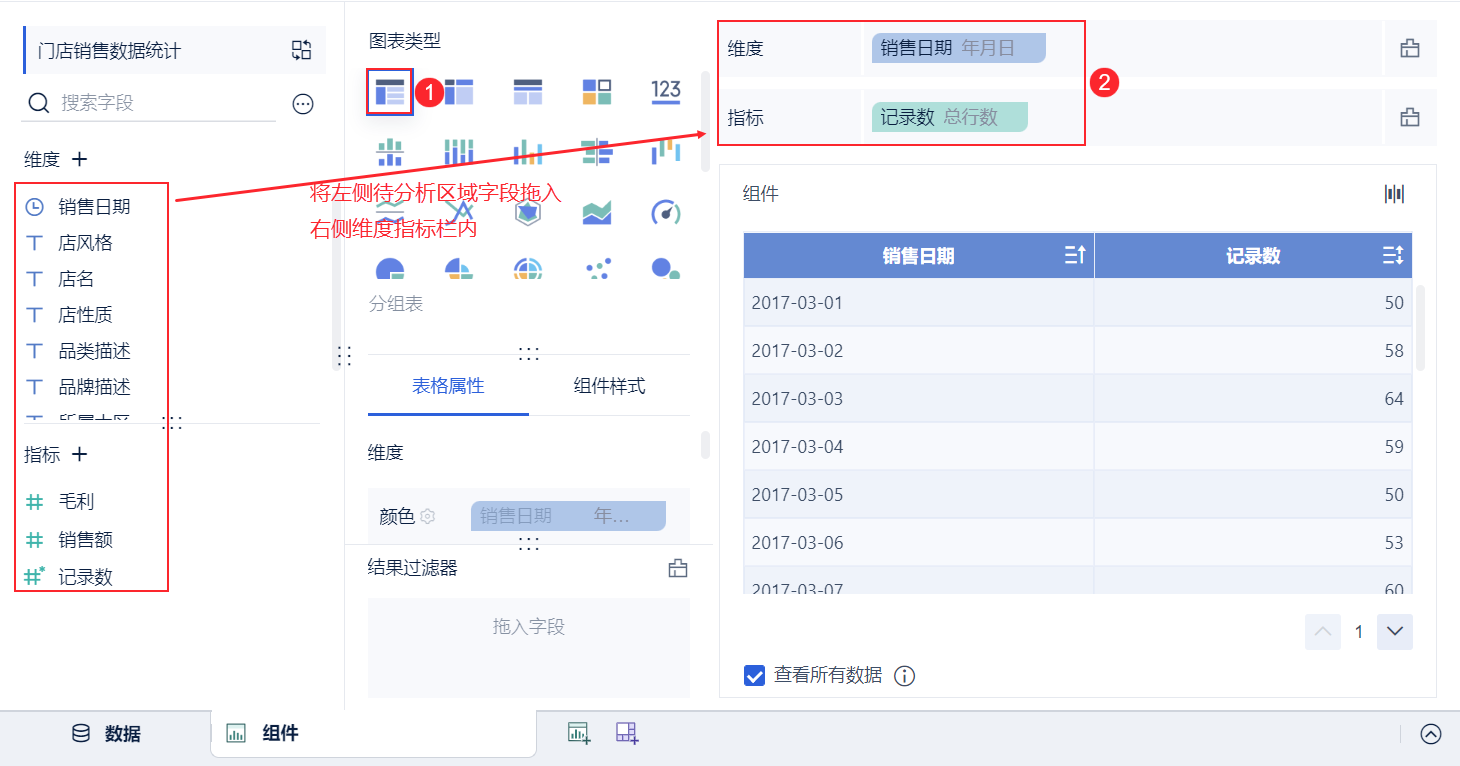 添加组件后,在左侧待分析区域指标下会出现「记录数」字段;在分析区域的维度和指标中拖入「销售日期」和「记录数」字段,如下图所示: