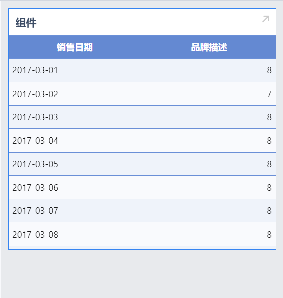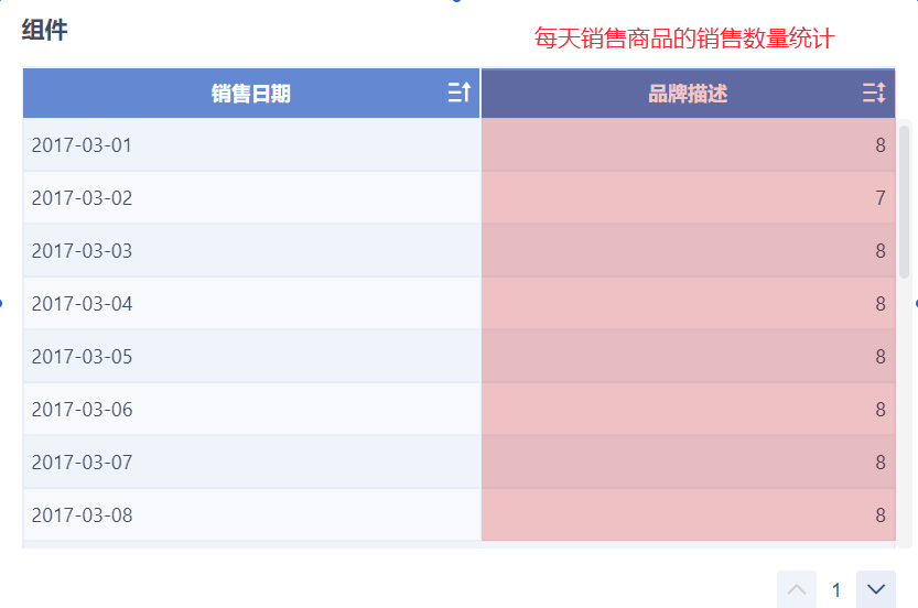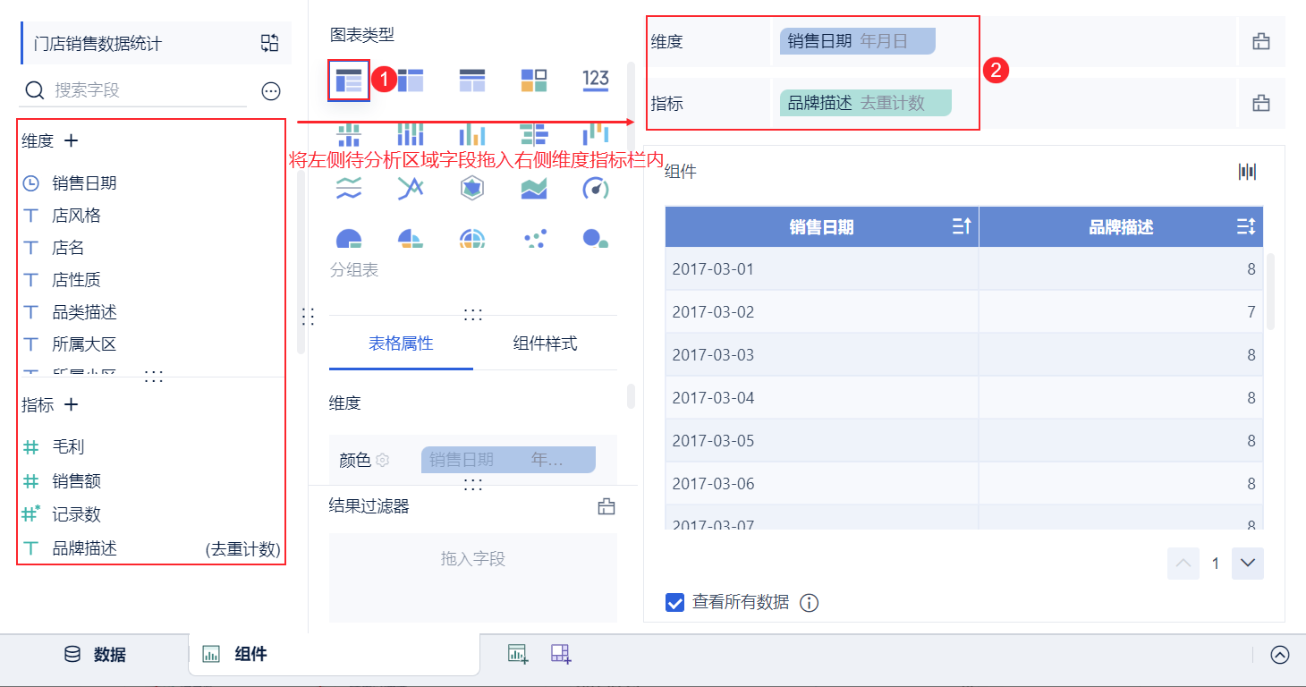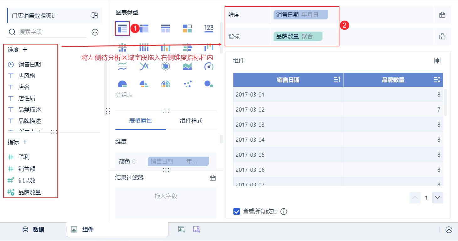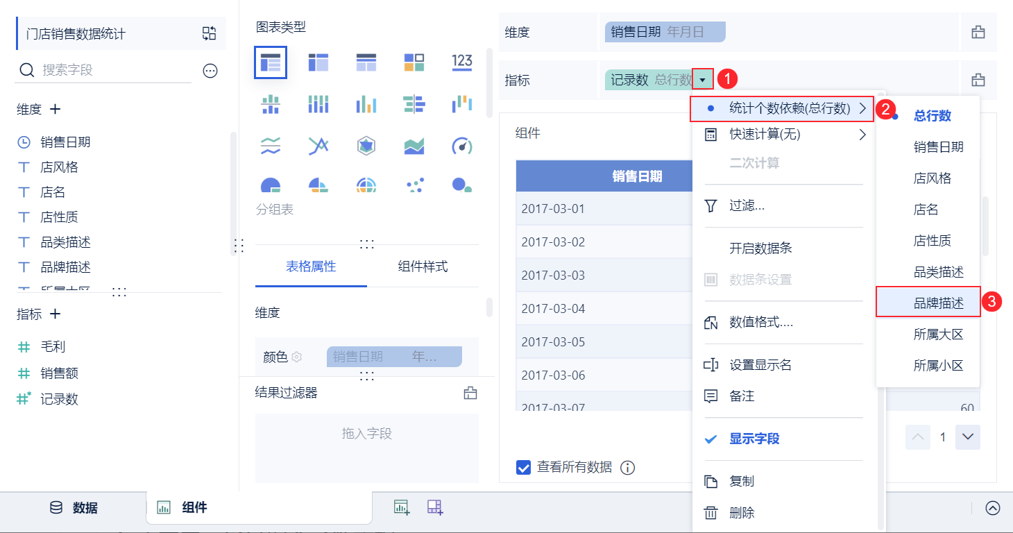 以「零售行业」业务包下的「门店销售数据统计表」为例,统计每天销售的品牌种类数量,在组件中使用 COUNTD_AGG 函数实现。