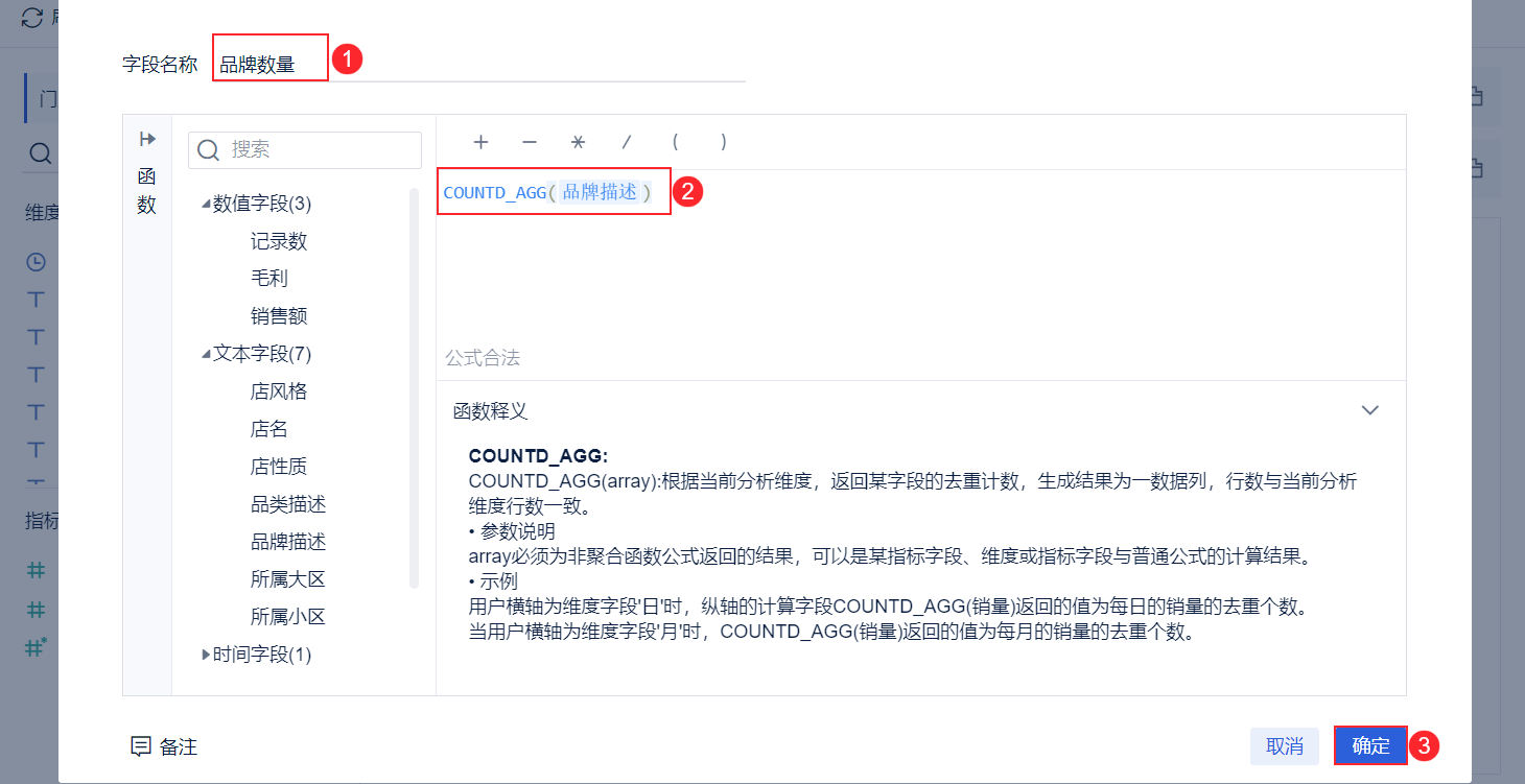 2)输入公式:COUNTD_AGG(品牌描述),得出「品牌描述」在对应维度下去重计数的统计值。设置好指标名称之后,点击「确定」,如下图所示: