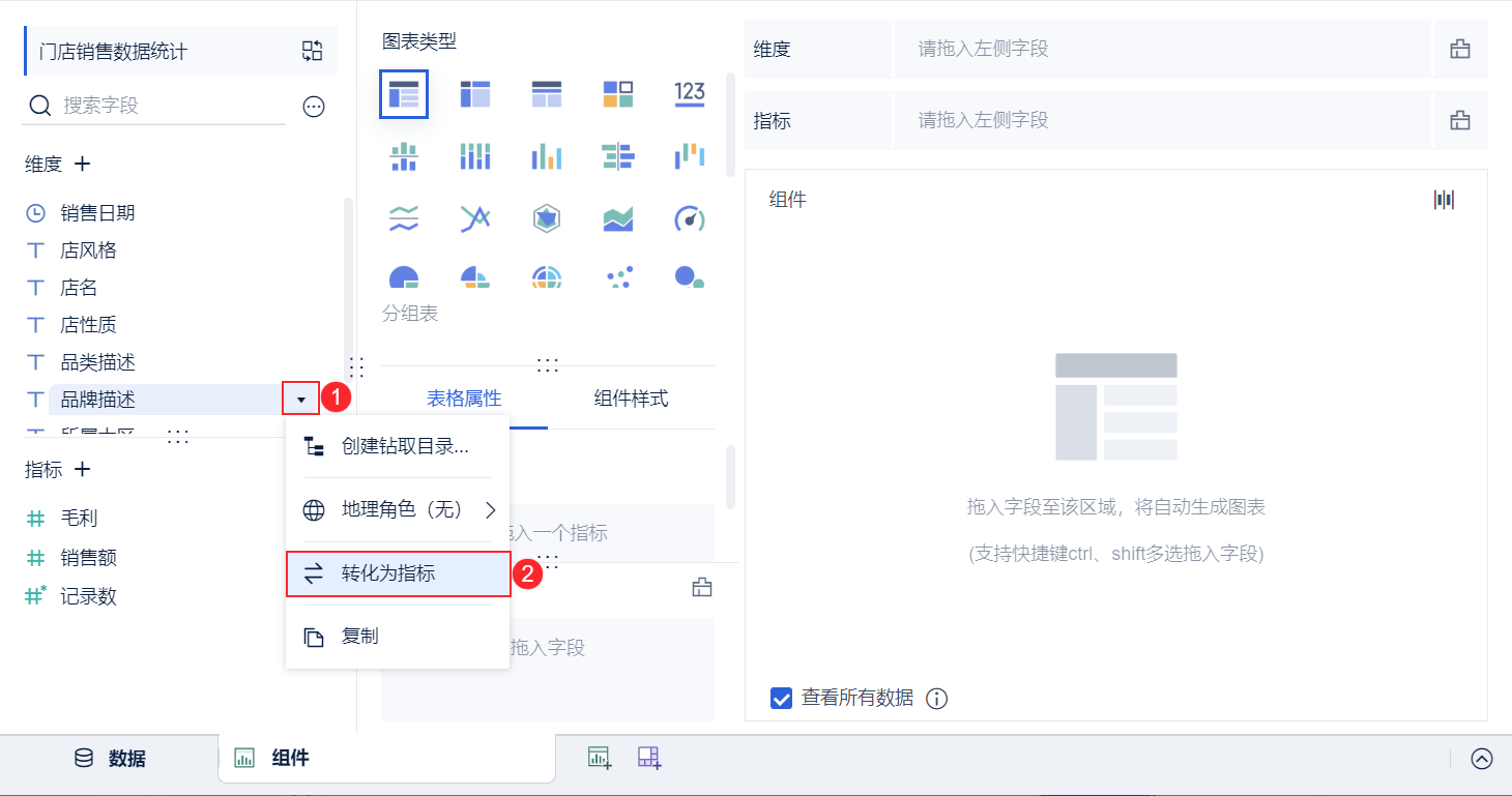 将「品牌描述」字段,从维度「转化为指标」,实现去重计数。如下图所示:
