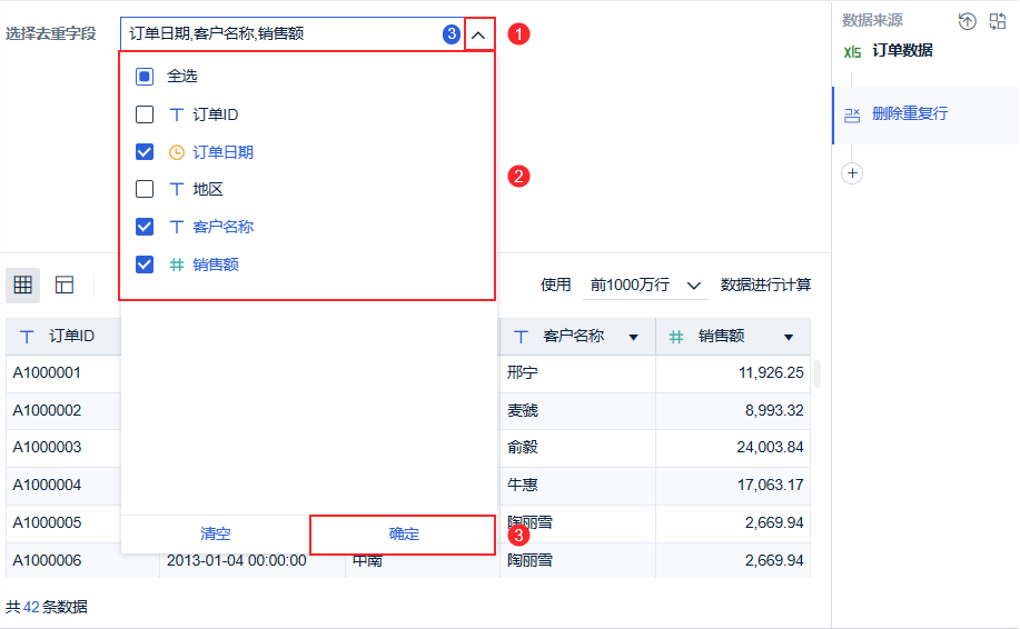 3)系统按照所选的去重字段判断是否有重复行。若订单日期相同、客户名称相同、订单金额相同,我们基本可以确定这是同一个订单了。