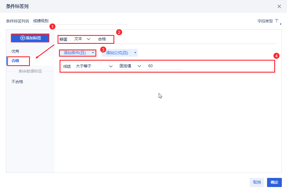 添加条件,剩下的数据若满足「大于等于 60 分」,则打上标签「合格」。如下图所示:
