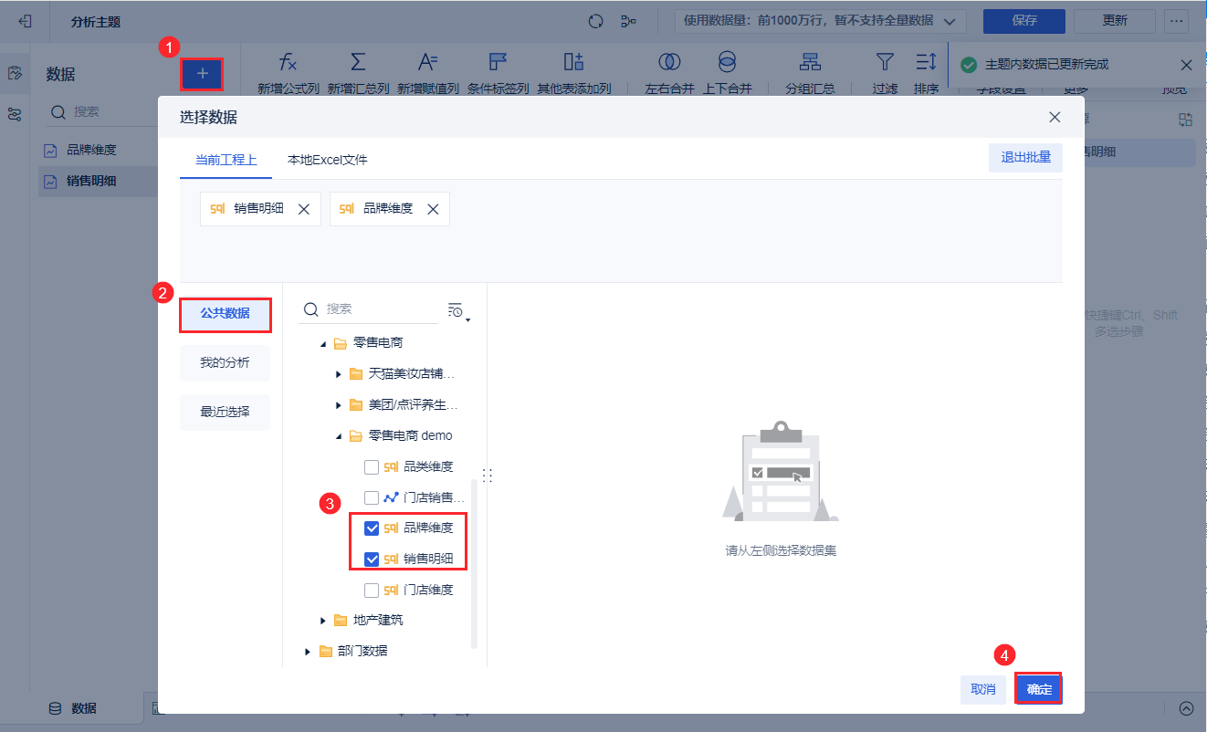 1)新建分析主题,并添加数据。使用在零售行业下找到 FineBI 自带的数据表「销售明细」和「品牌维度」表。可以批量选择,如下图所示: