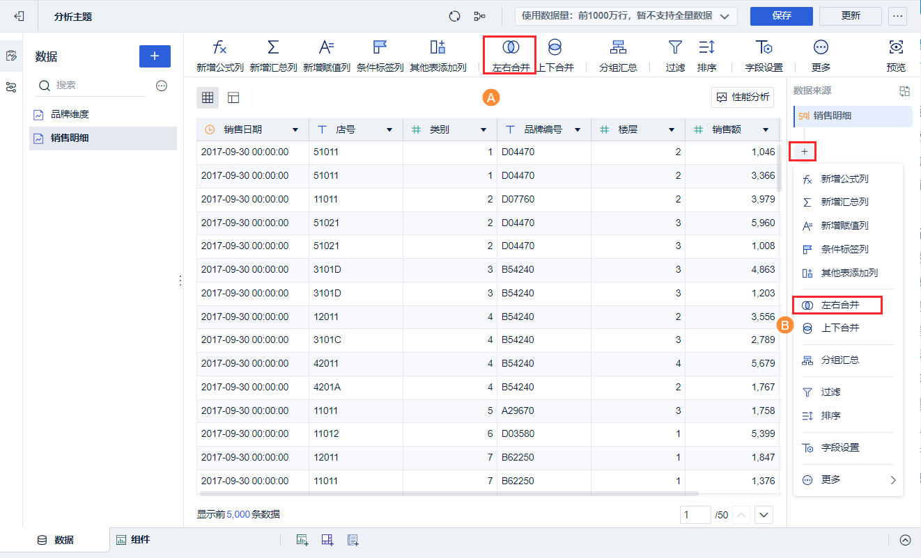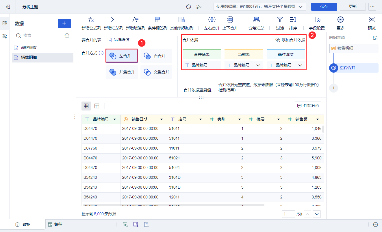 将「销售明细」和「品牌维度」两张表的字段合到一张表进行分析。