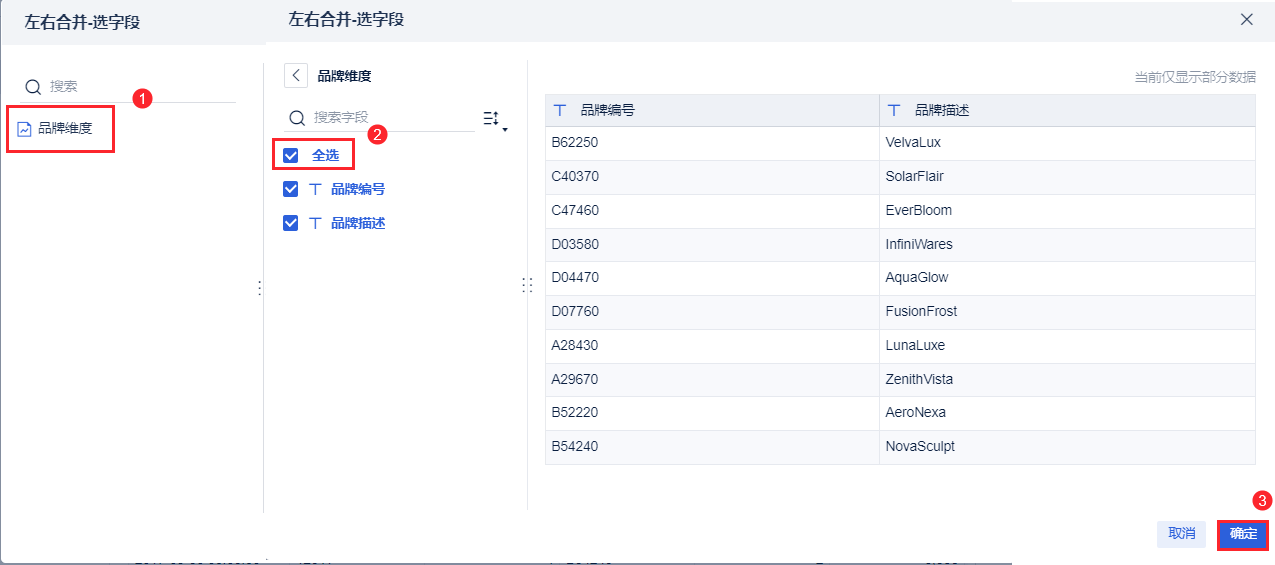 2)选择要左右合并的表「品牌维度」,并勾选该表中要参与左右合并的字段。如下图所示:
