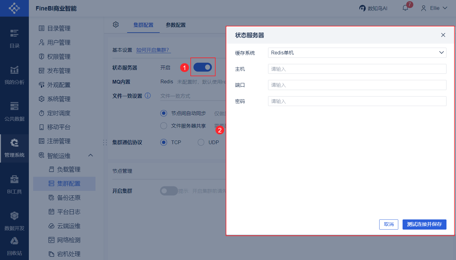 状态服务器和外置数据库是开启集群的前置条件,若未配置外置数据库,则参考文档进行配置:配置外接数据库