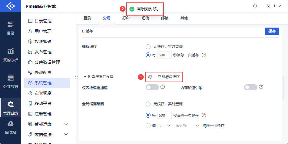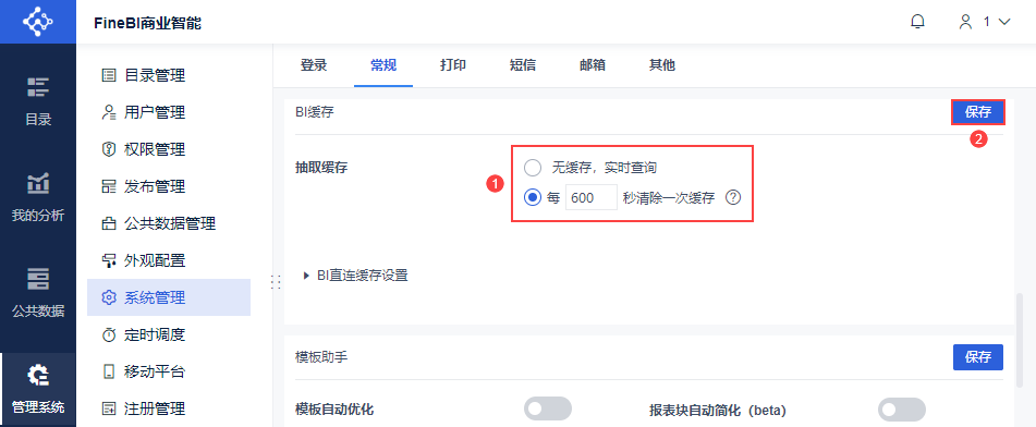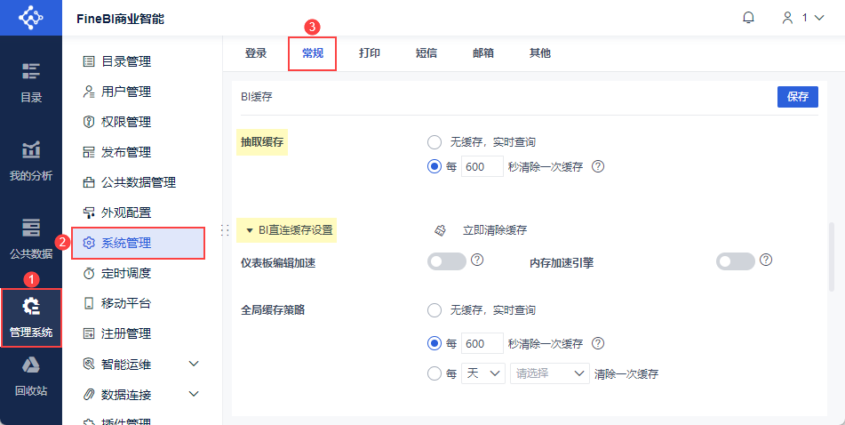 点击「管理系统>系统管理>常规」,可进行「直连缓存」和「抽取缓存」设置,如下图所示: