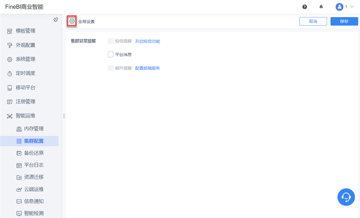 点击「全局设置」按钮设置提醒方式,比如勾选「短信提醒」、「平台消息」、「邮件提醒」,设置完成后点击保存即可。默认全不开启,如下图所示: