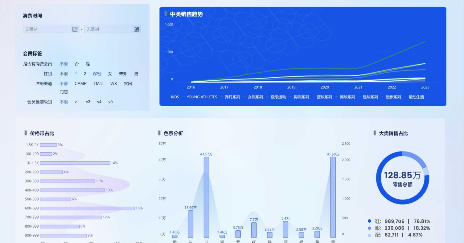 零售行业商品预测分析,帮助用户使用BI进行产品销售预测,给选品做出决策依据。详情请参见:零售业人货场分析案例背景介绍