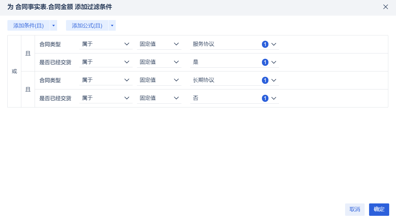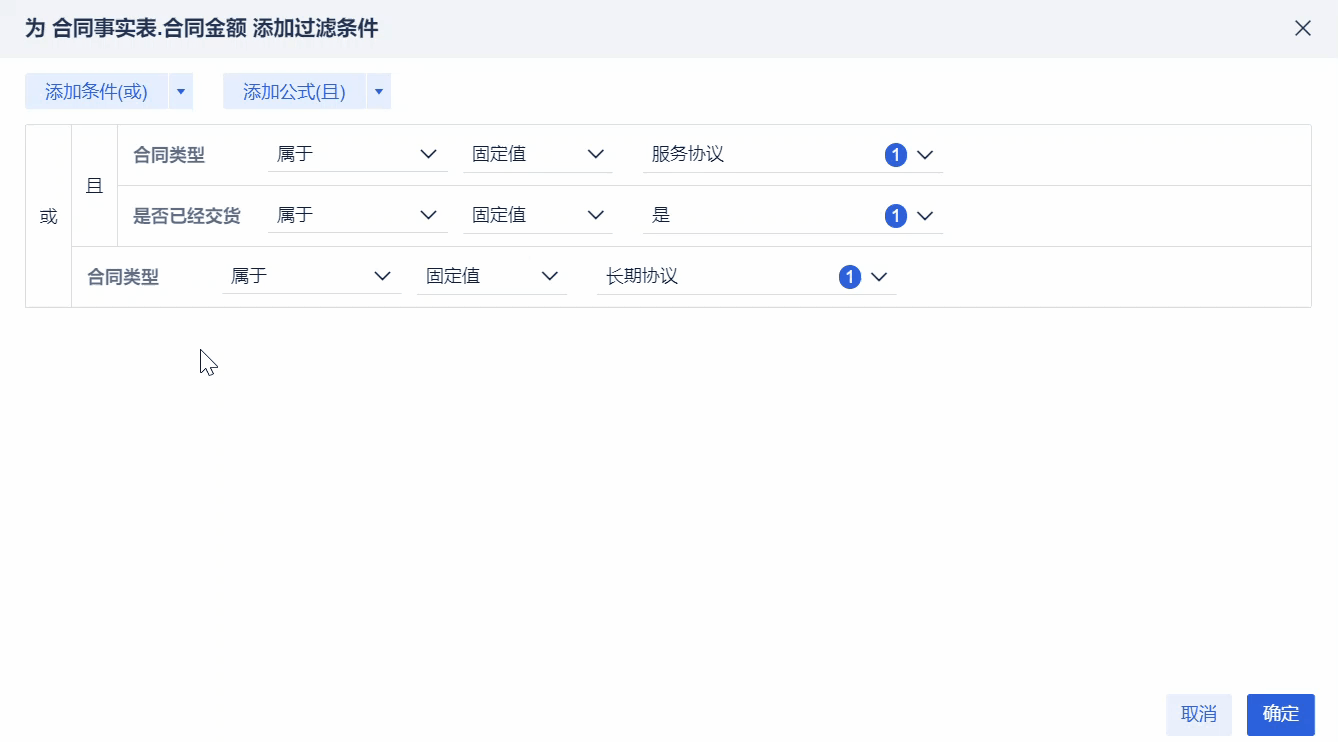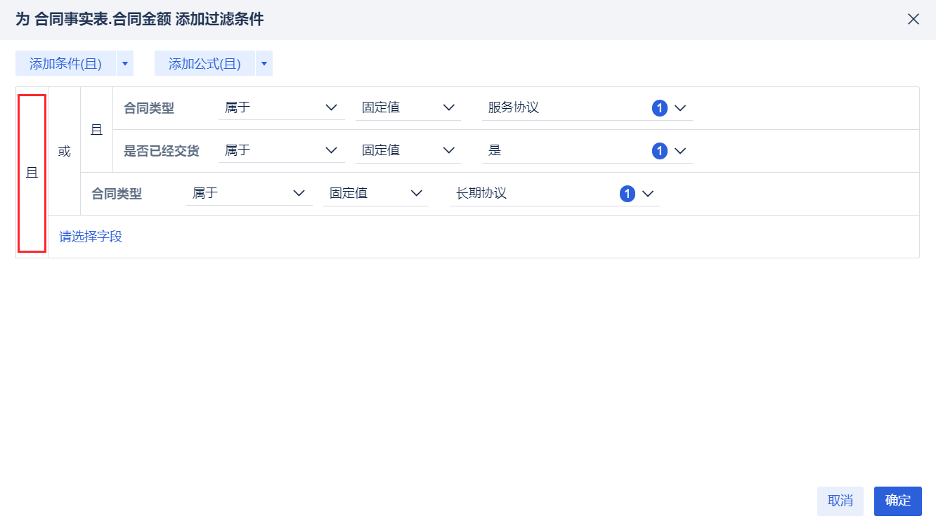 1)先添加第一个条件,“合同类型属于服务协议”,如下图所示: