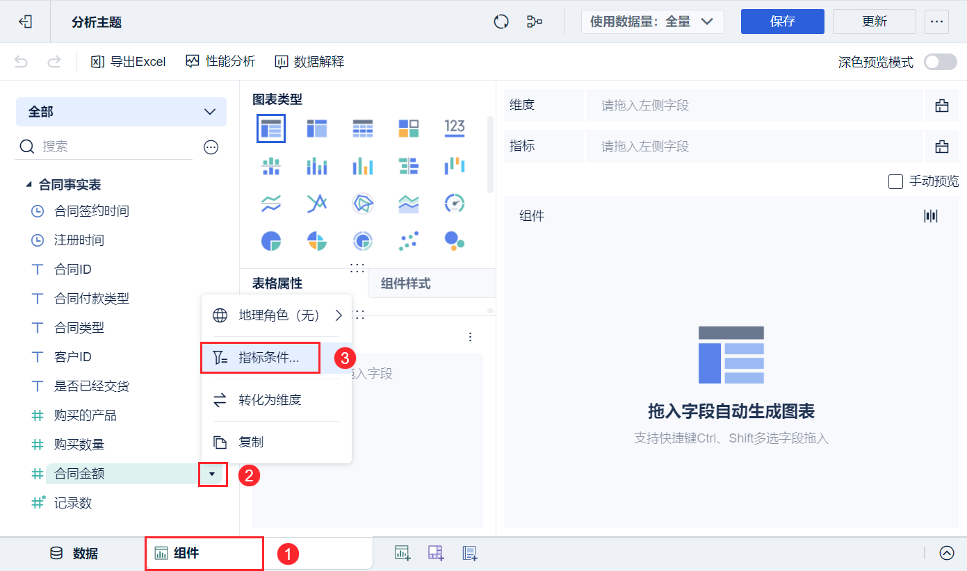2)添加组件,进入组件编辑界面,选择「合同金额」字段指标条件。如下图所示: