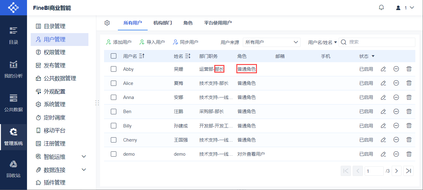 管理员登录FineBI系统,点击「管理系统>权限管理>普通权限配置」,为部门「销售部>销售主管」分配数据权限。