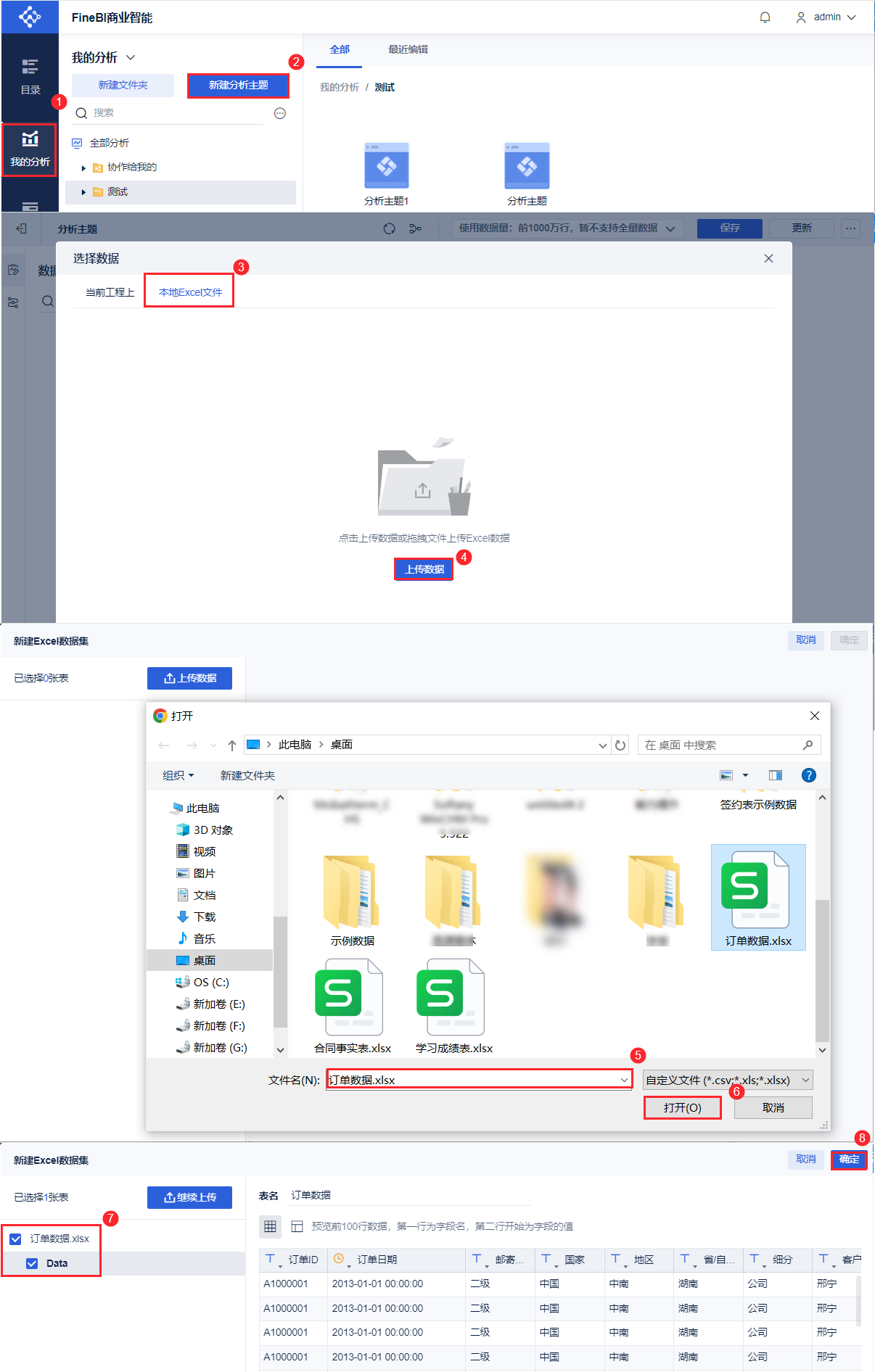 2)新建分析主题,上传下载的示例数据。如下图所示: