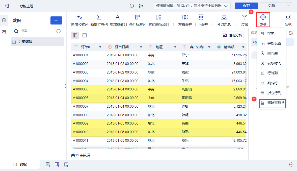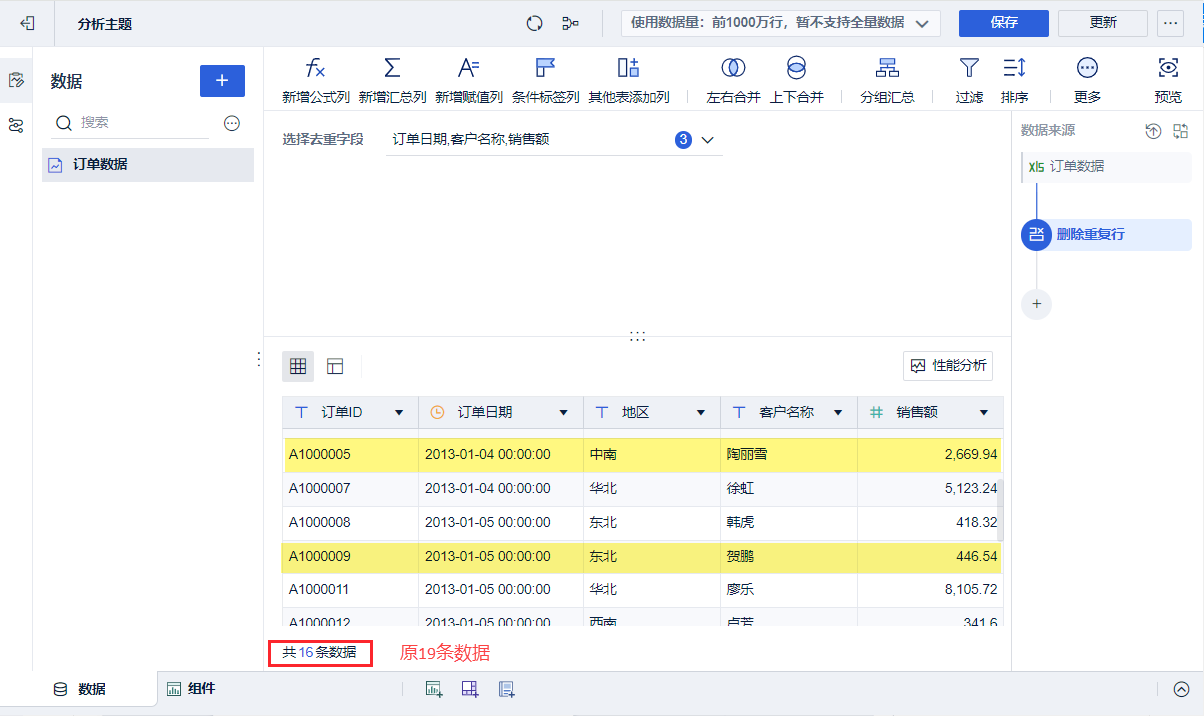 2)系统按照所选的去重字段判断是否有重复行。若订单日期相同、客户名称相同、订单金额相同,我们基本可以确定这是同一个订单了。