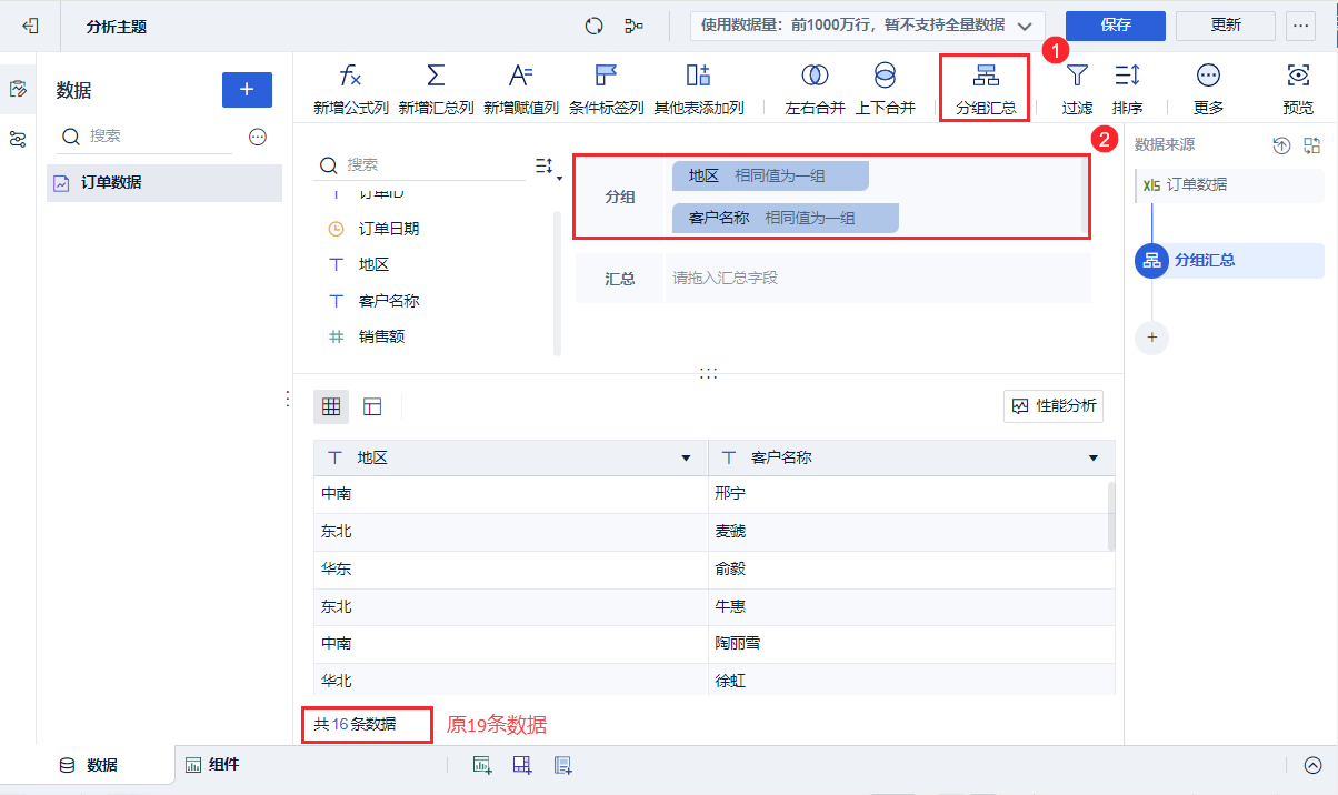 商家想将所有消费的用户名单统计出来,但是原始数据中,每个用户可能消费了多次,有多条数据。但我们只需要保留一条就可以了,此时就可以使用「分组汇总」对数据进行「相同值为一组」实现效果。