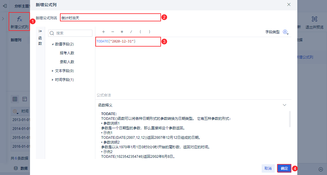 新增「新增公式列」步骤,命名为「倒计时当天」,输入公式:TODATE("2022-12-31"),点击「确定」,如下图所示: