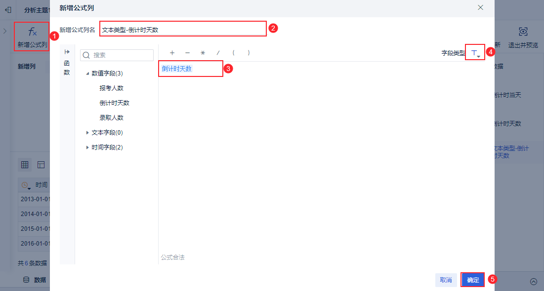 由于 2.3 中返回的倒计时天数为数值类型,后续在仪表板中使用指标卡会出现对所有数据行的倒计时天数进行累加,导致结果有错误,因此需要将其改成文本类型字段,如下图所示: