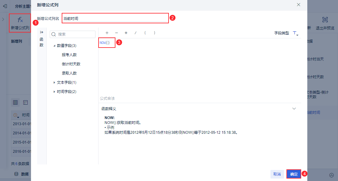 新增「新增公式列」步骤,命名为「当前时间」,输入公式NOW(),点击「确定」,如下图所示: